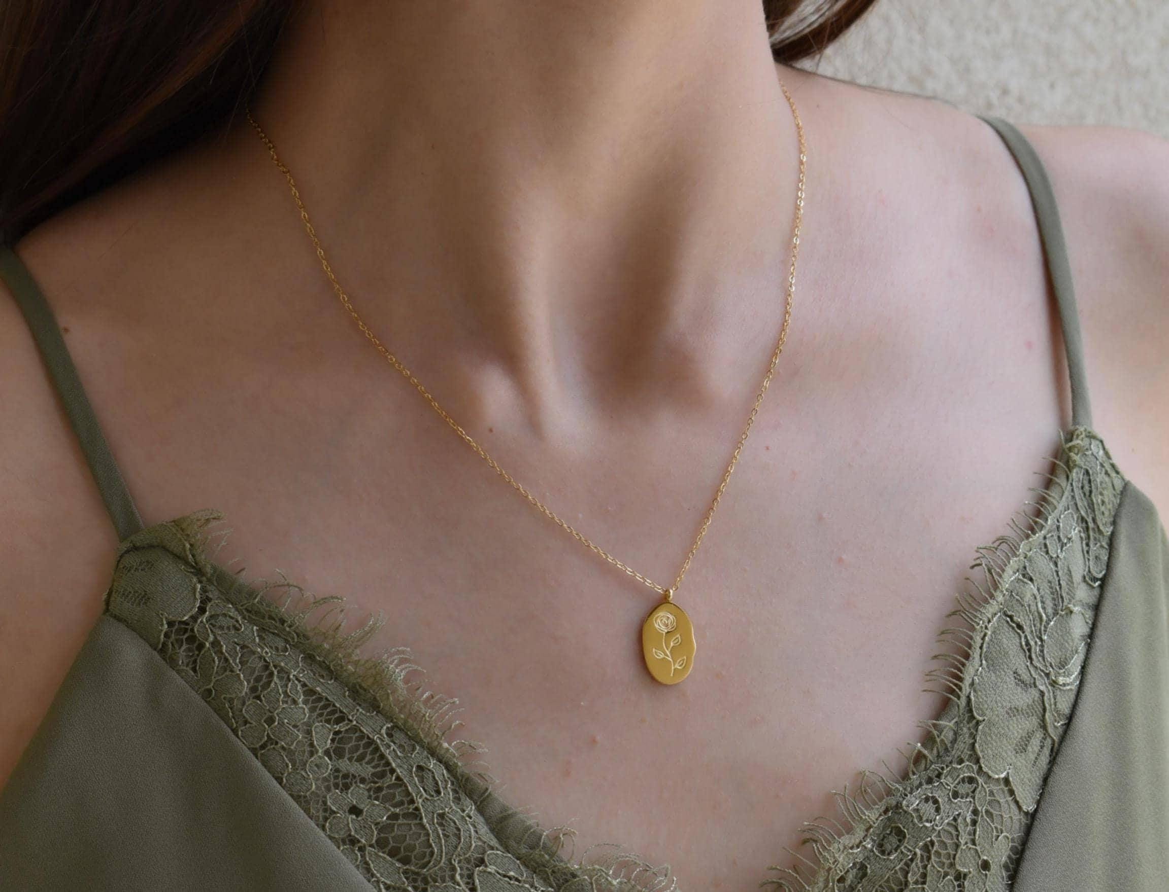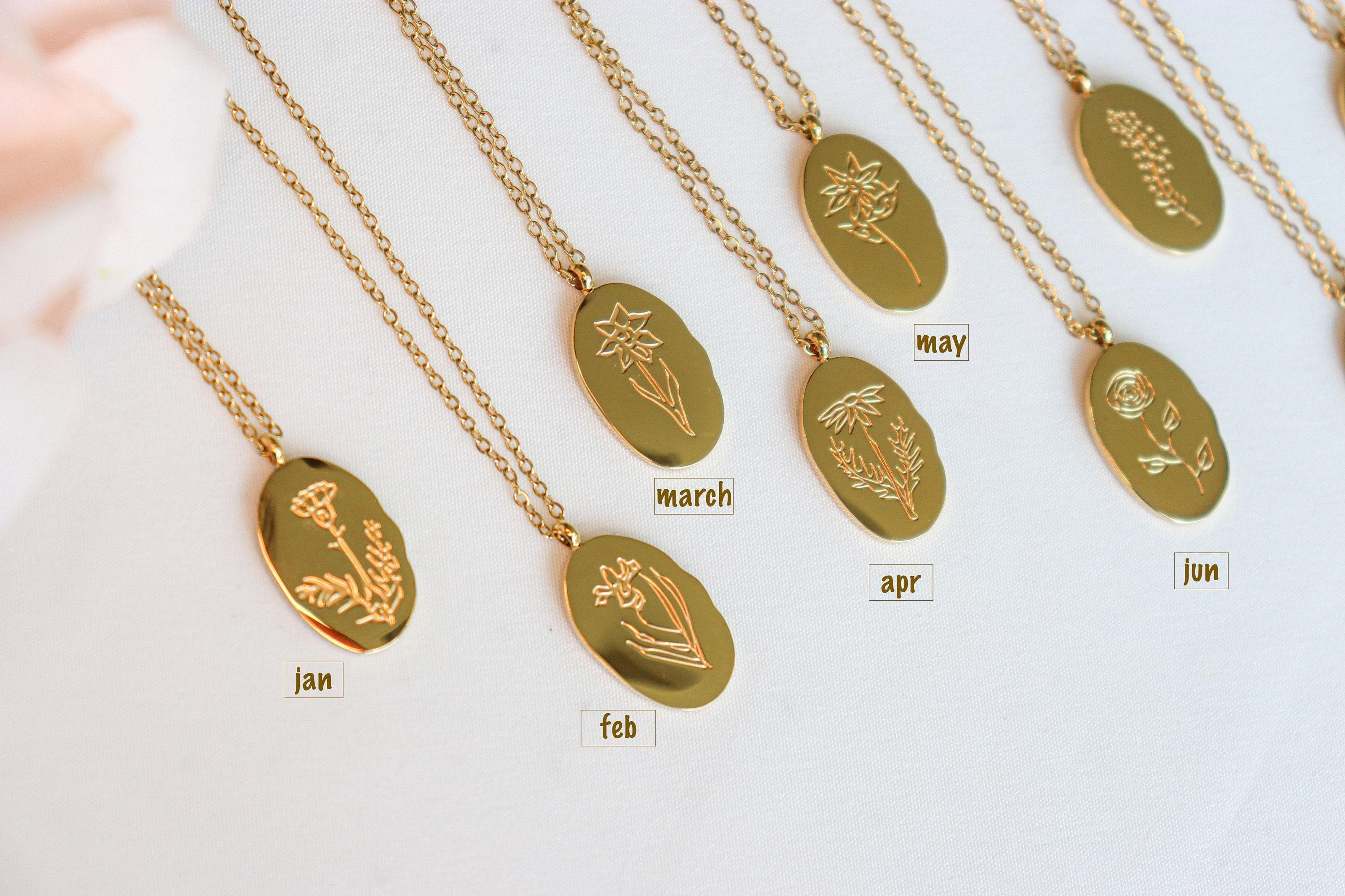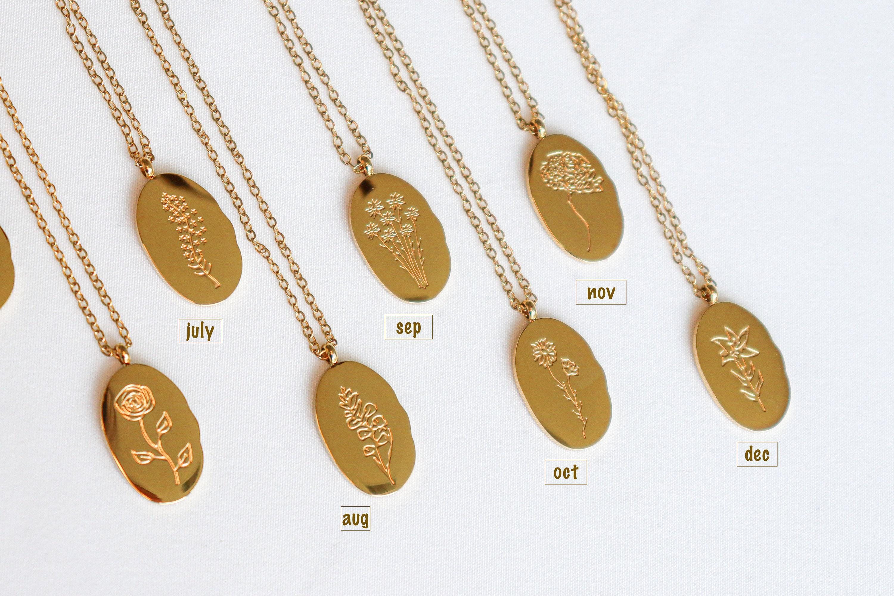 Each necklace features a delicate flower pendant that corresponds to the flower associated with your birth month.