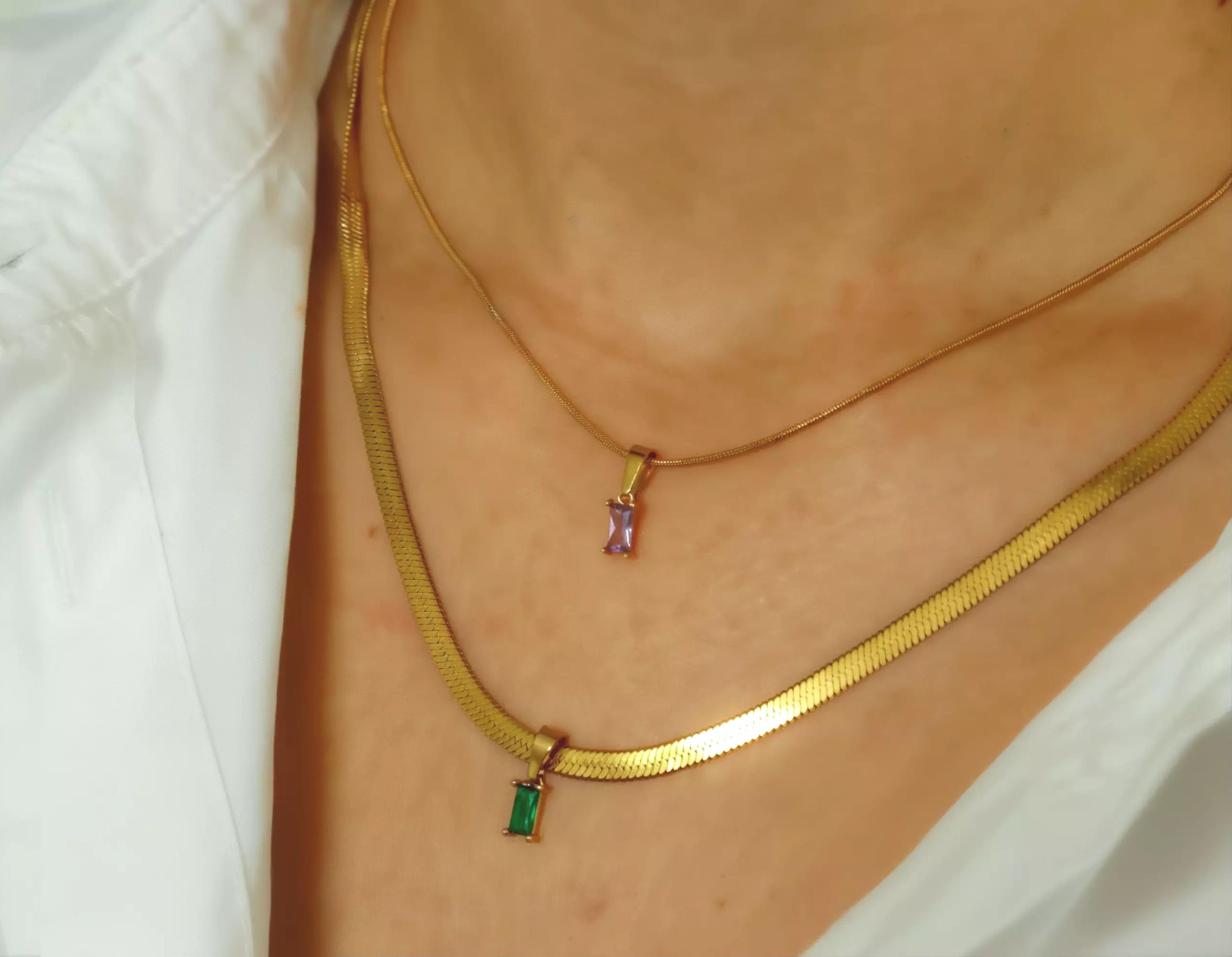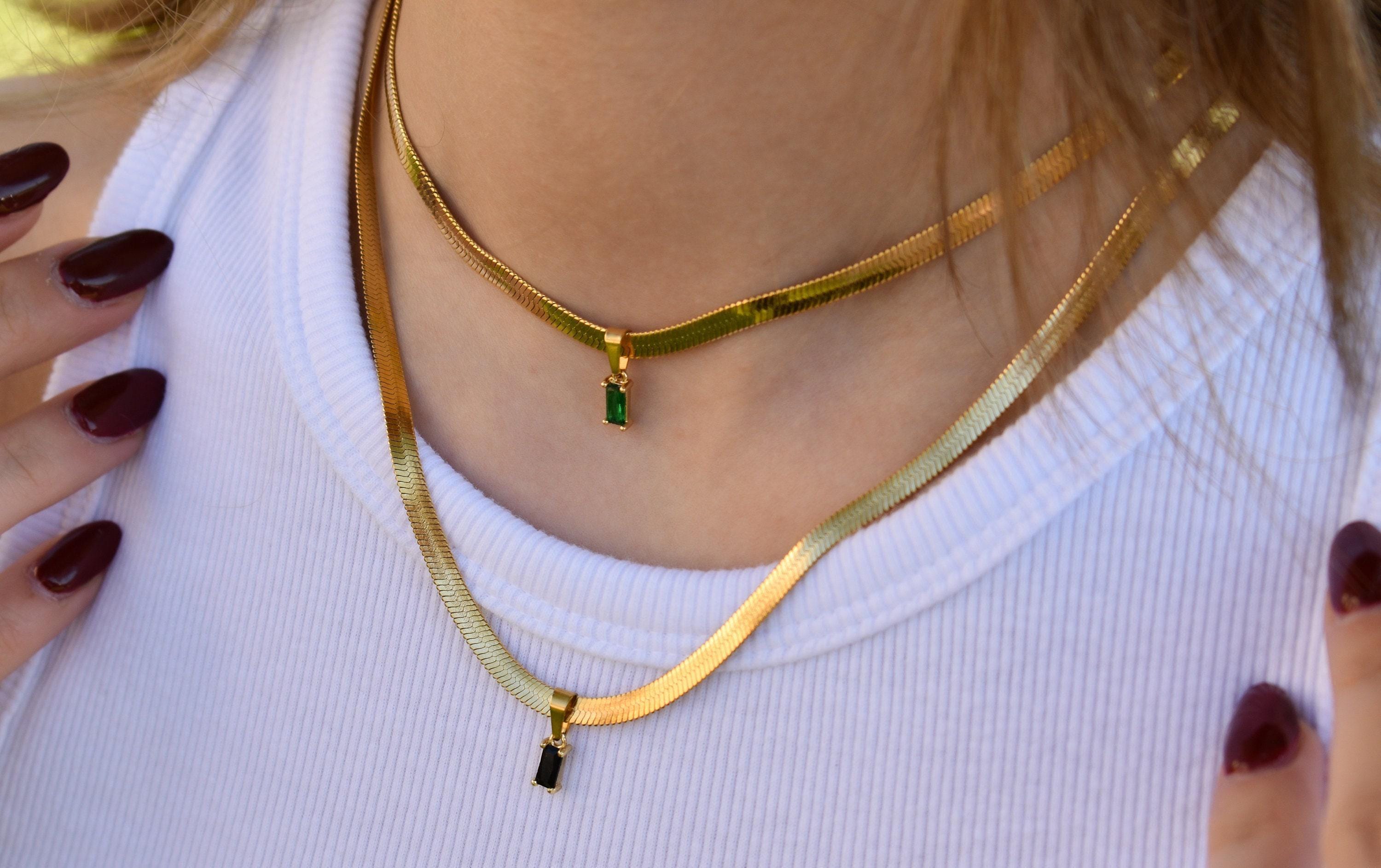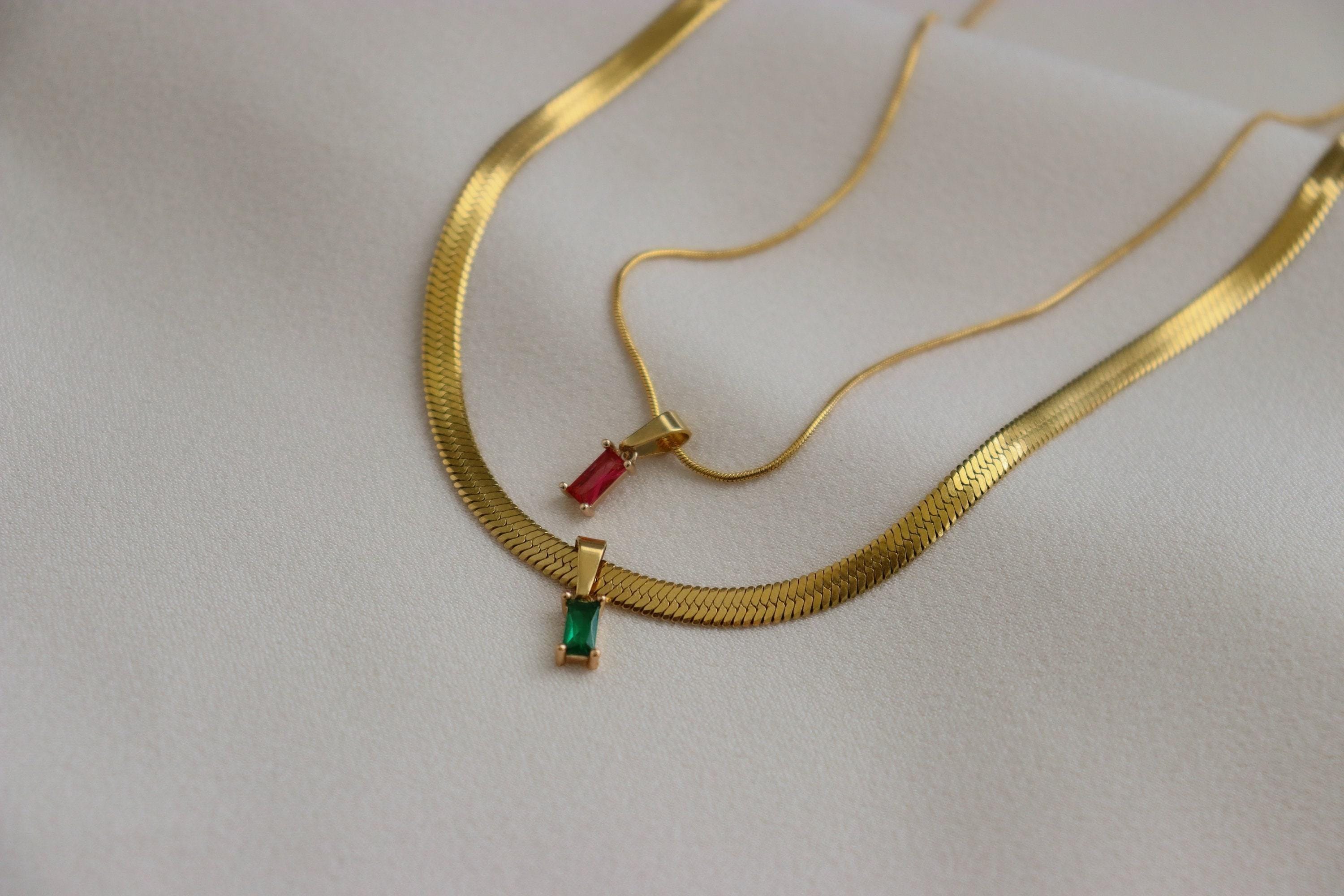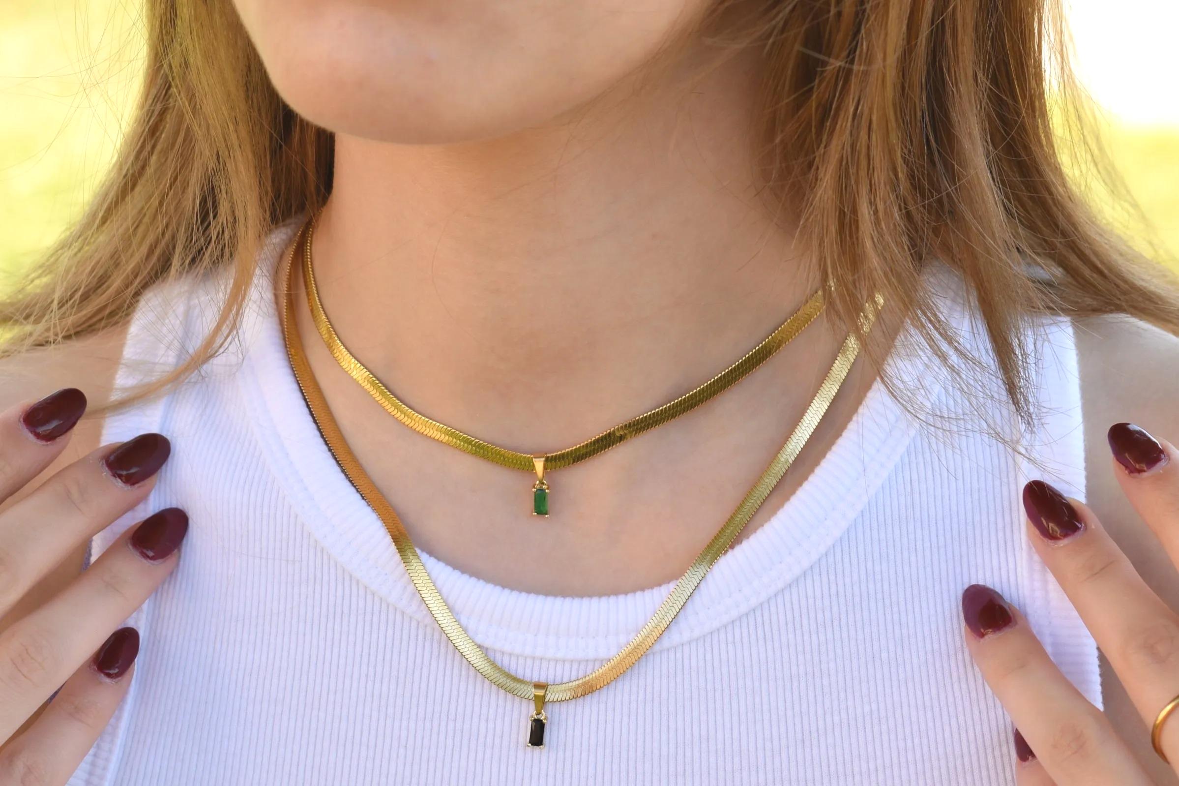 GOLD HERRINGBONE SNAKE NECKLACE WITH ZIRCON STONE CHARMS