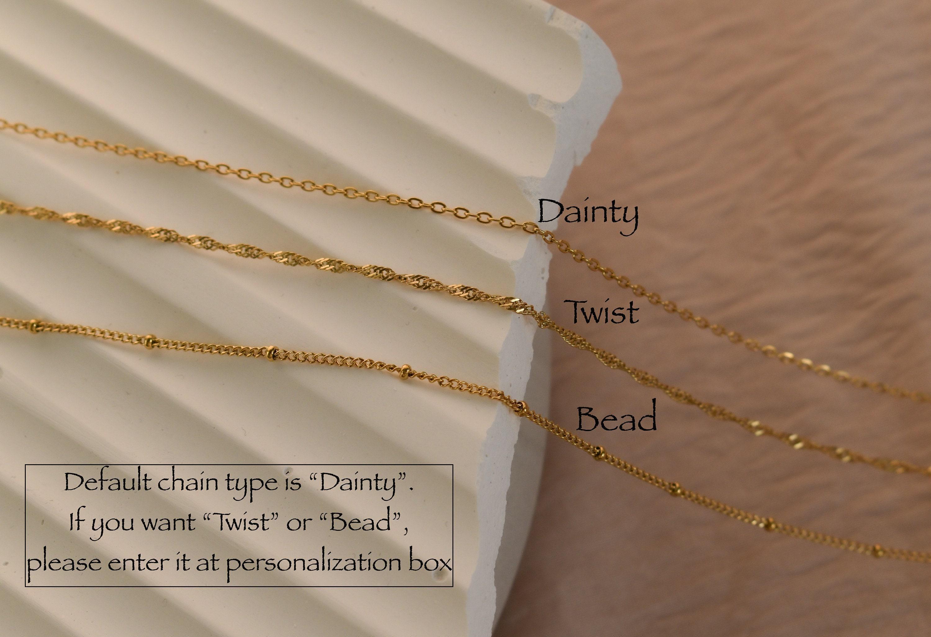 3️⃣ The gorgeous gold chain comes in dainty style chain but also available in twist, and bead, allowing you to find the right look to compliment your outfit. If you want a twist chain, or bead chain necklace, please tell us by entering it at personalization box.