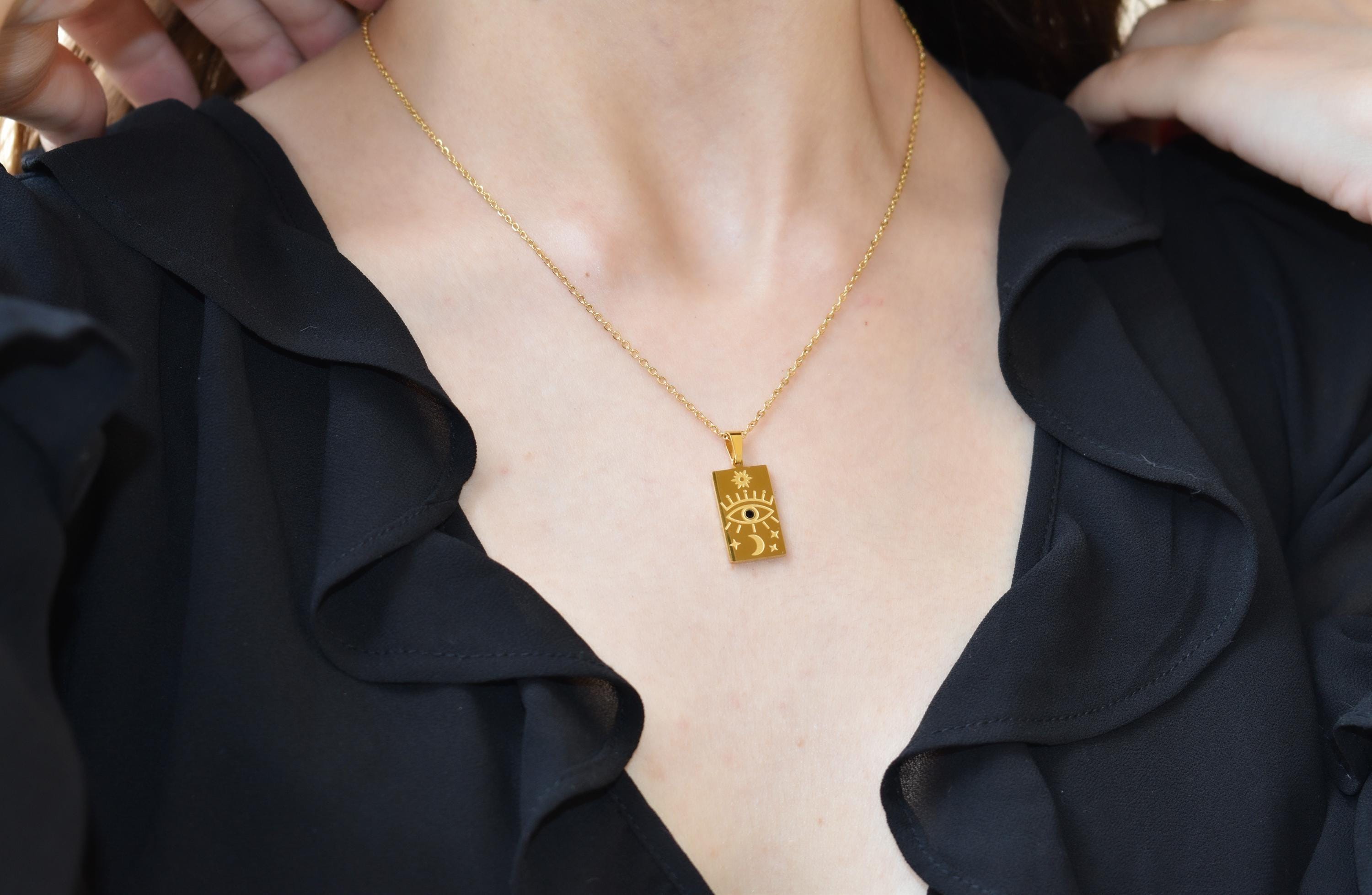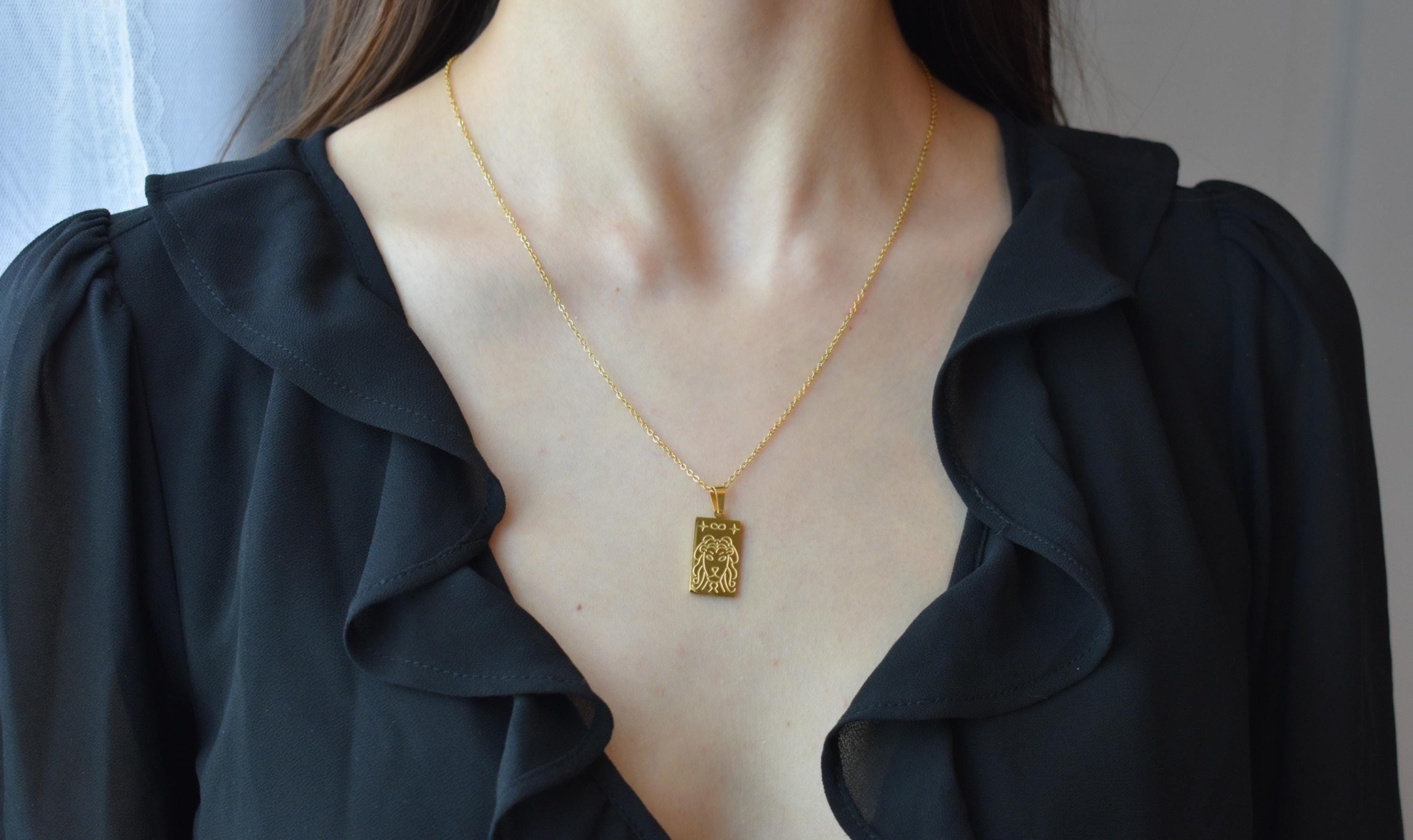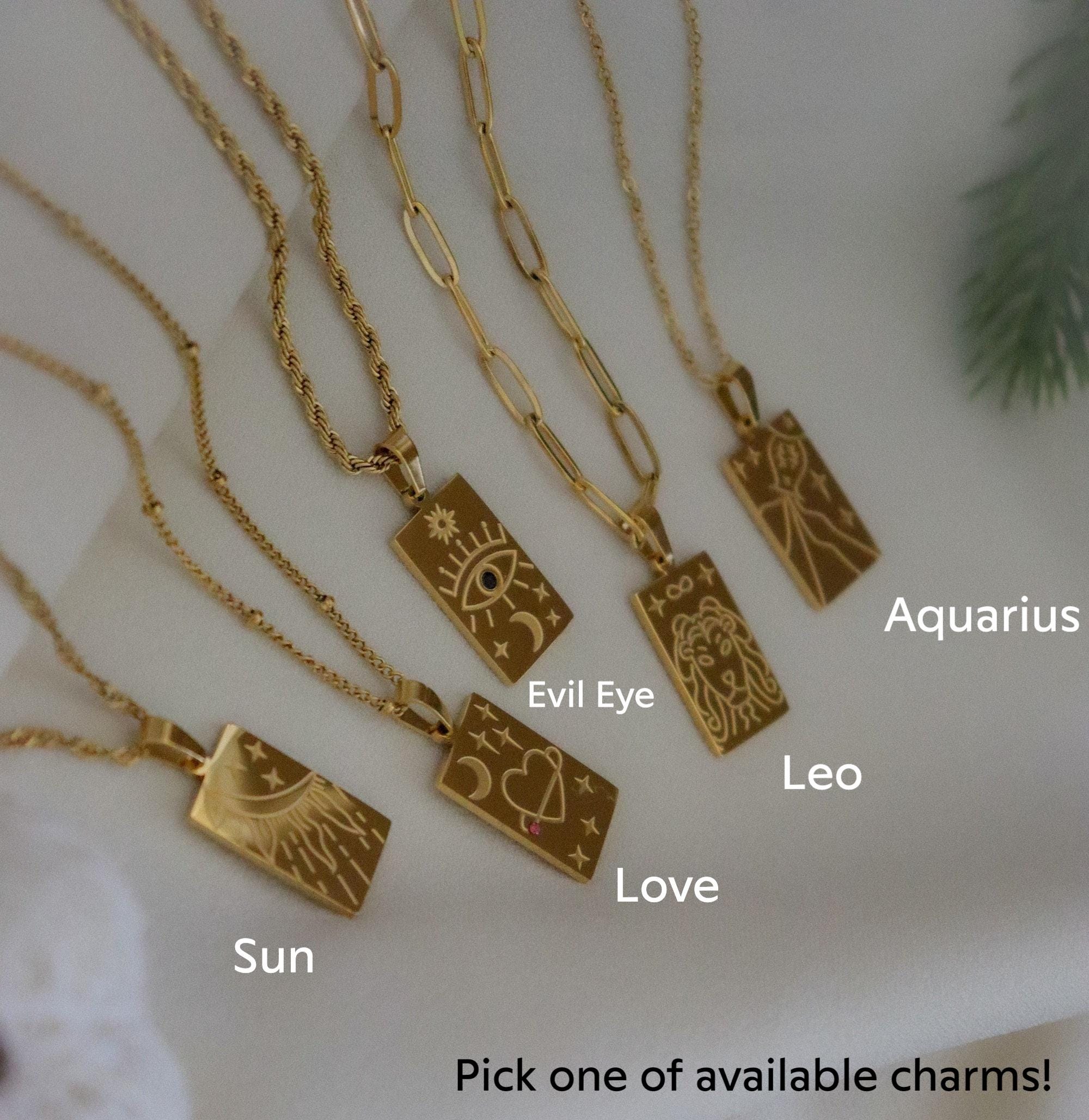 Gold Tarot Square Pendant Necklace Aquarius Heart Sun Evil Eye Leo Zodiac Sign Tarot Card Deck Necklace Waterproof Jewelry Minimalist Gift