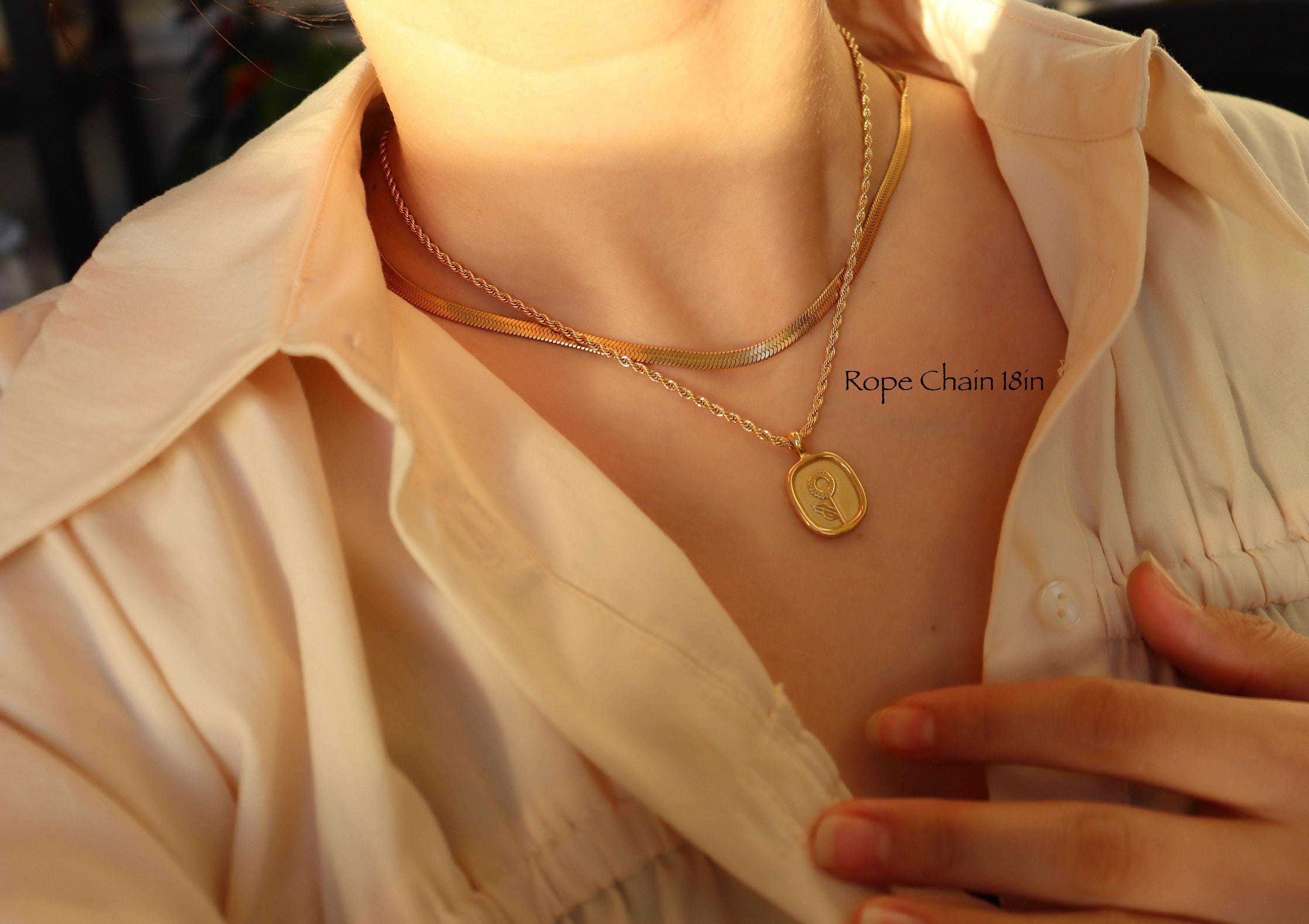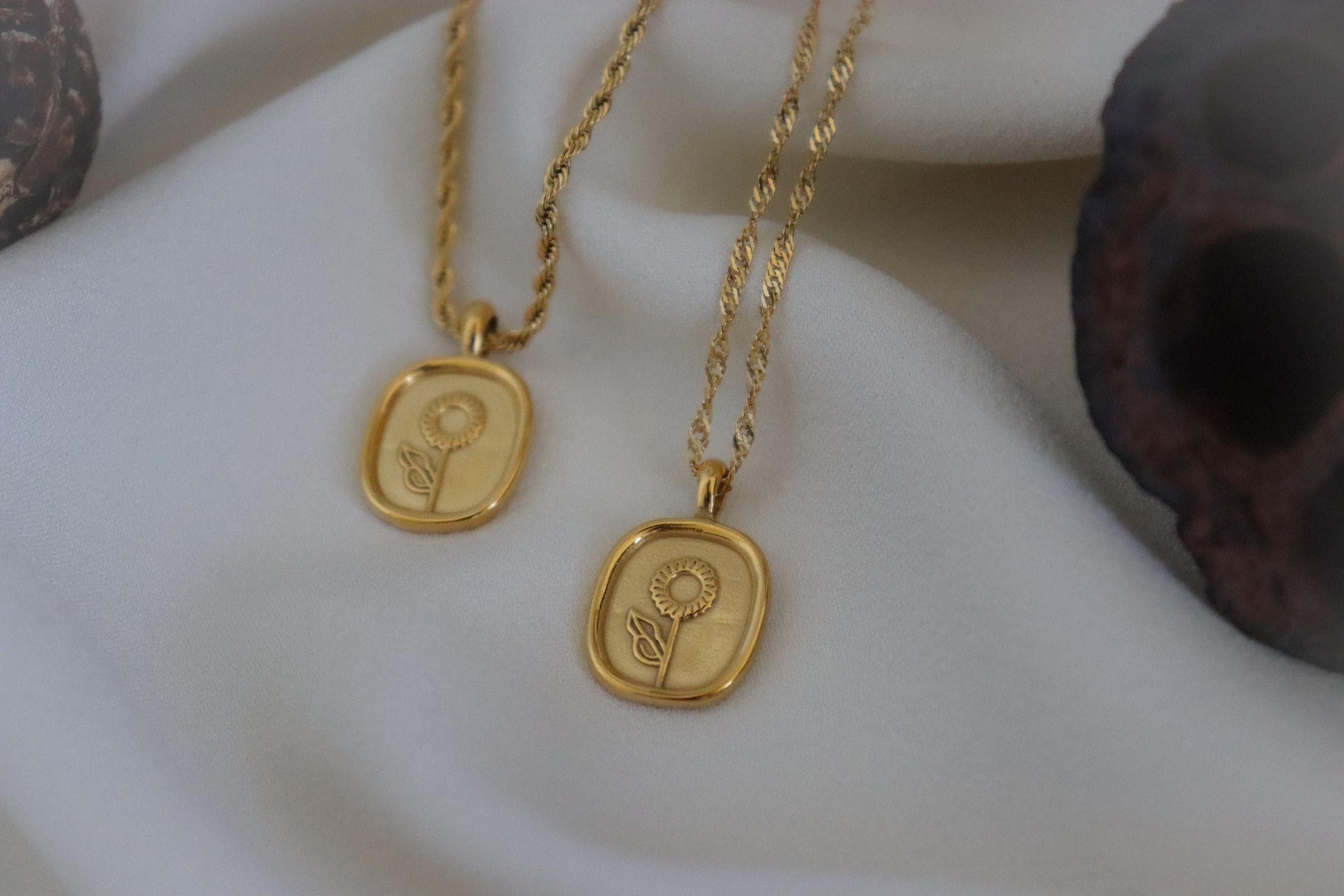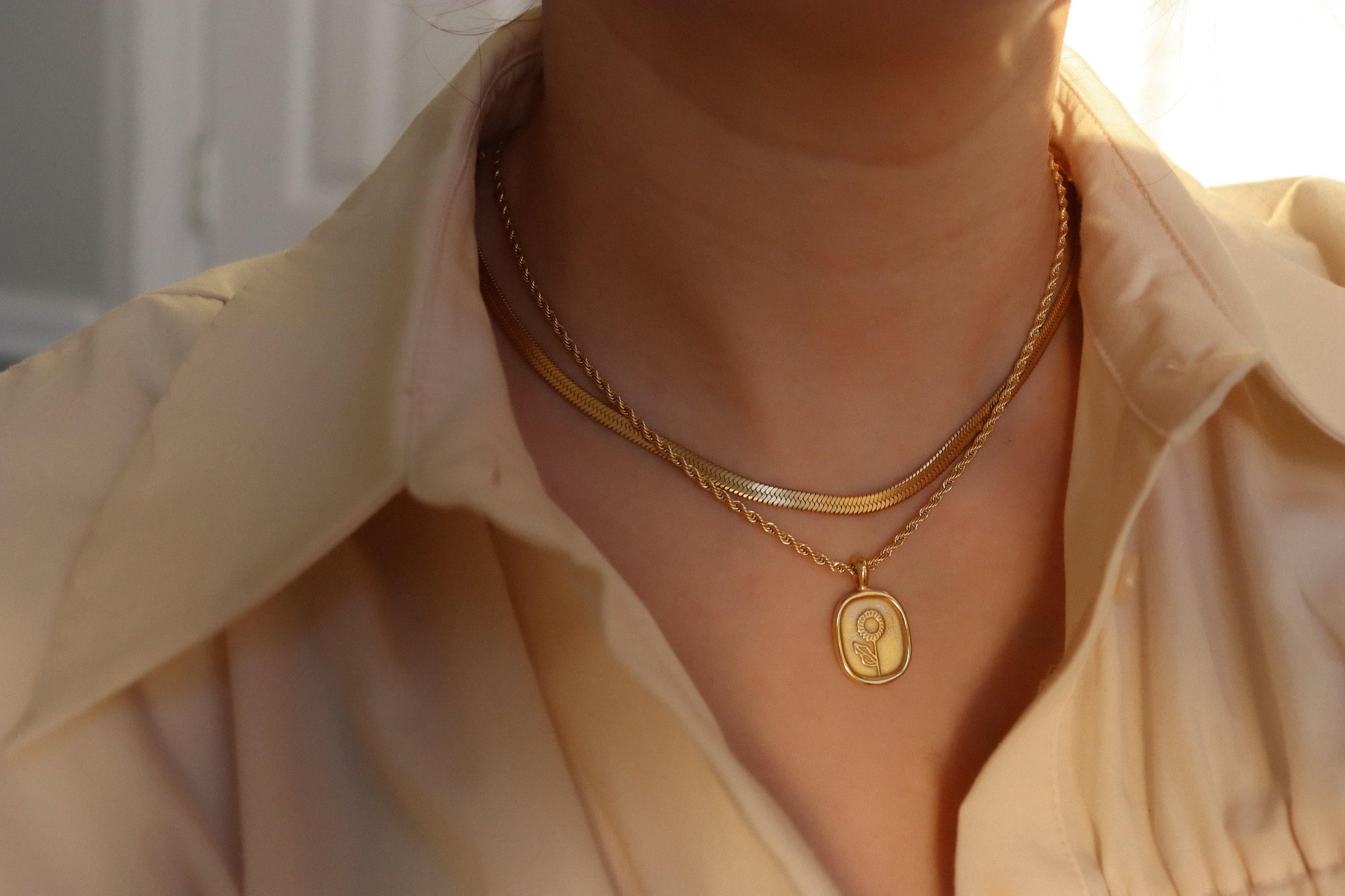 Gold Flower Necklace Round Oval Coin Necklace Waterproof Jewelry Stainless Steel Chain Necklace Vintage Style Rose Personalized Pendant