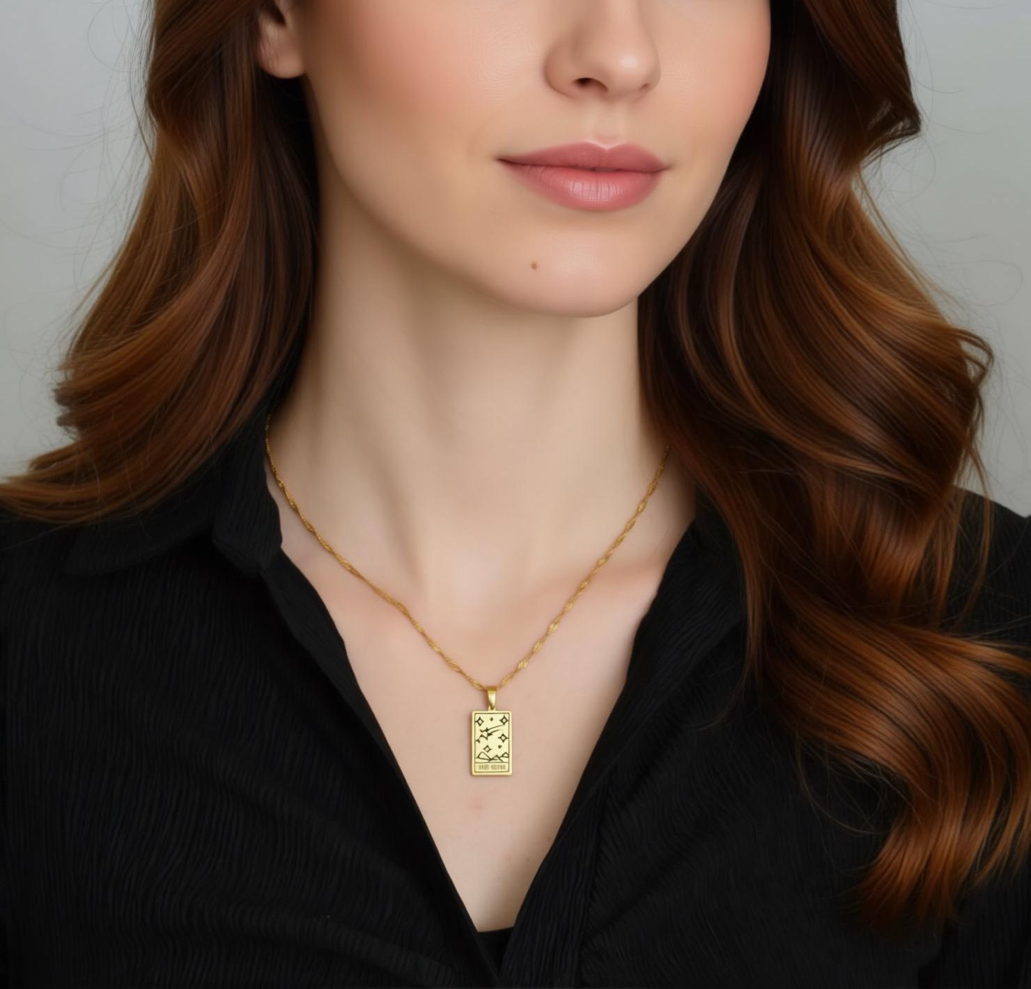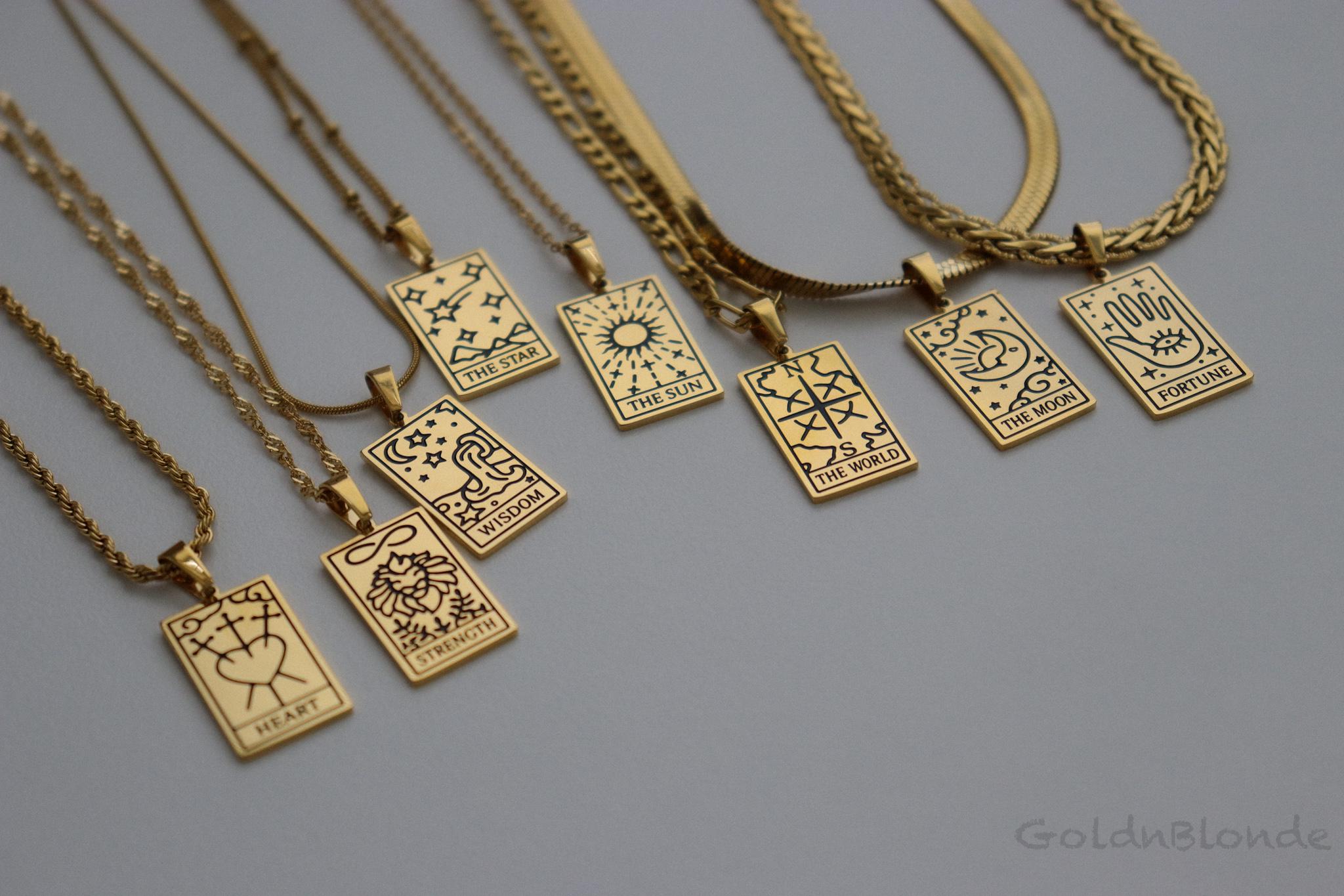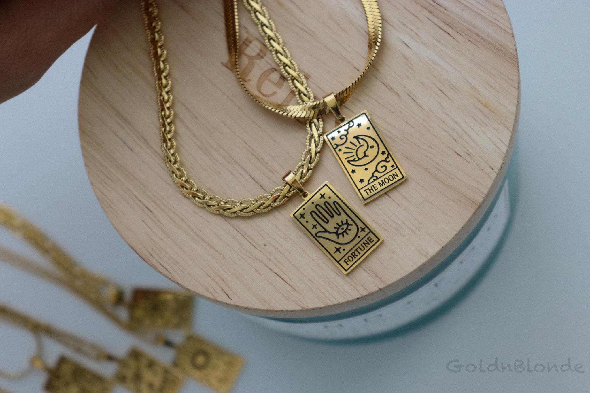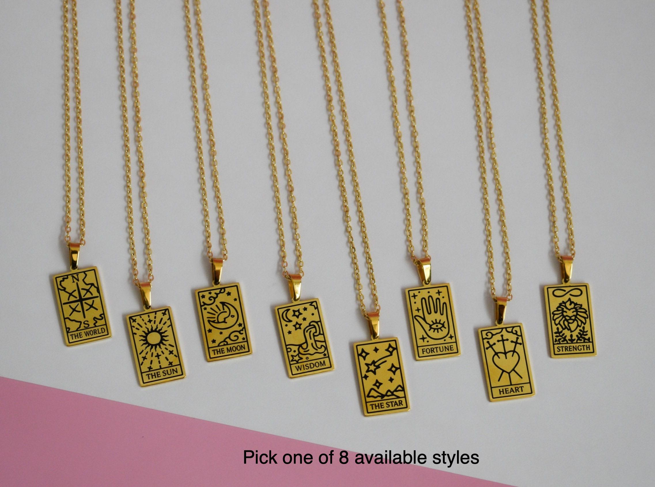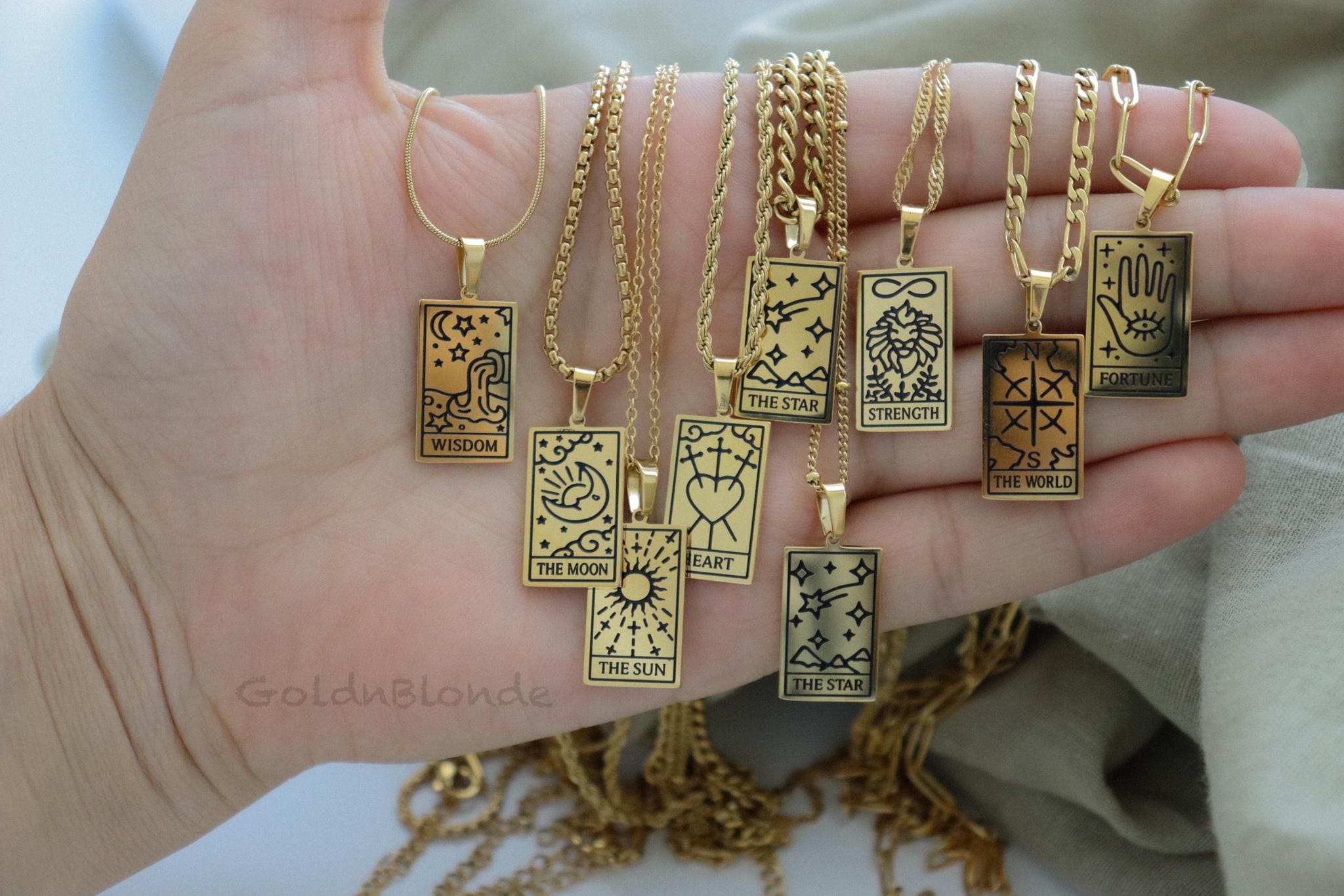 Gold Rectangle Zodiac Sign Tarot Card Necklace Anti Tarnish Tarot Jewelry Sun Fortune Star Moon Heart Mystic Jewelry Gift