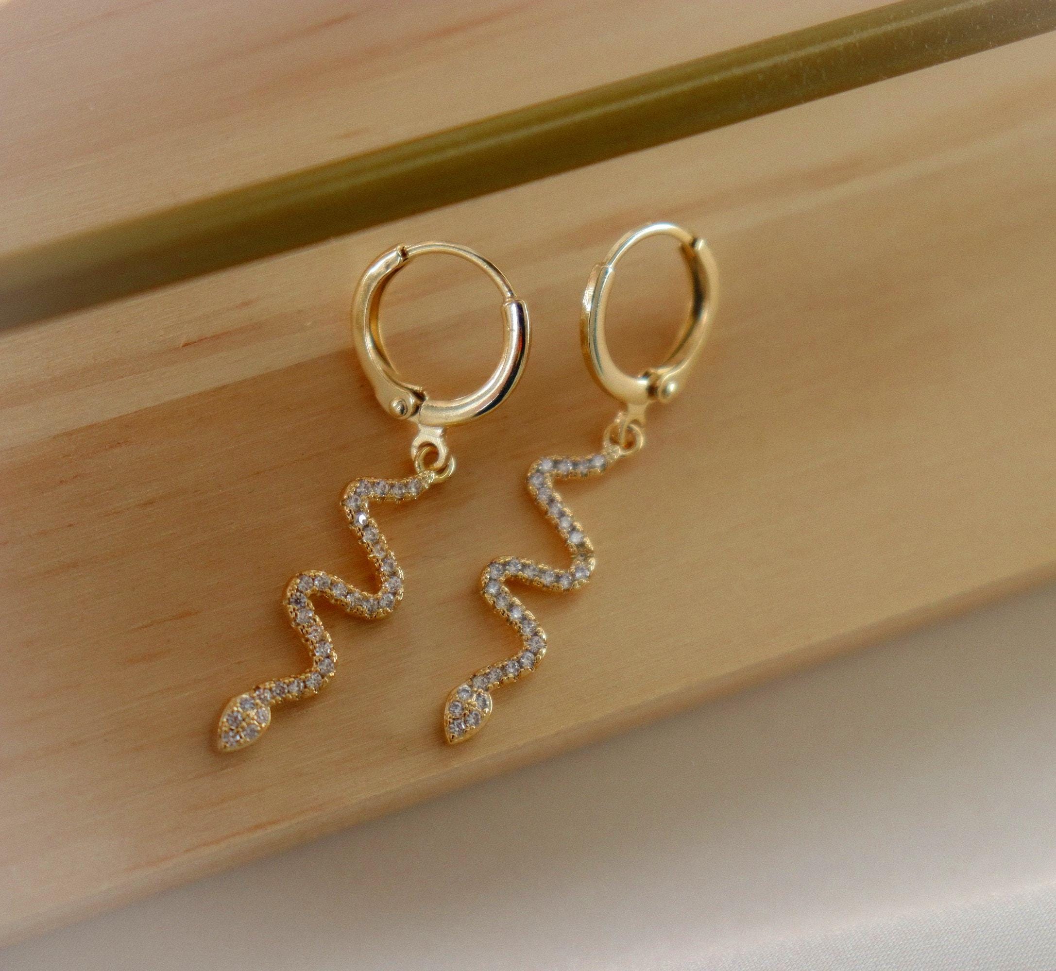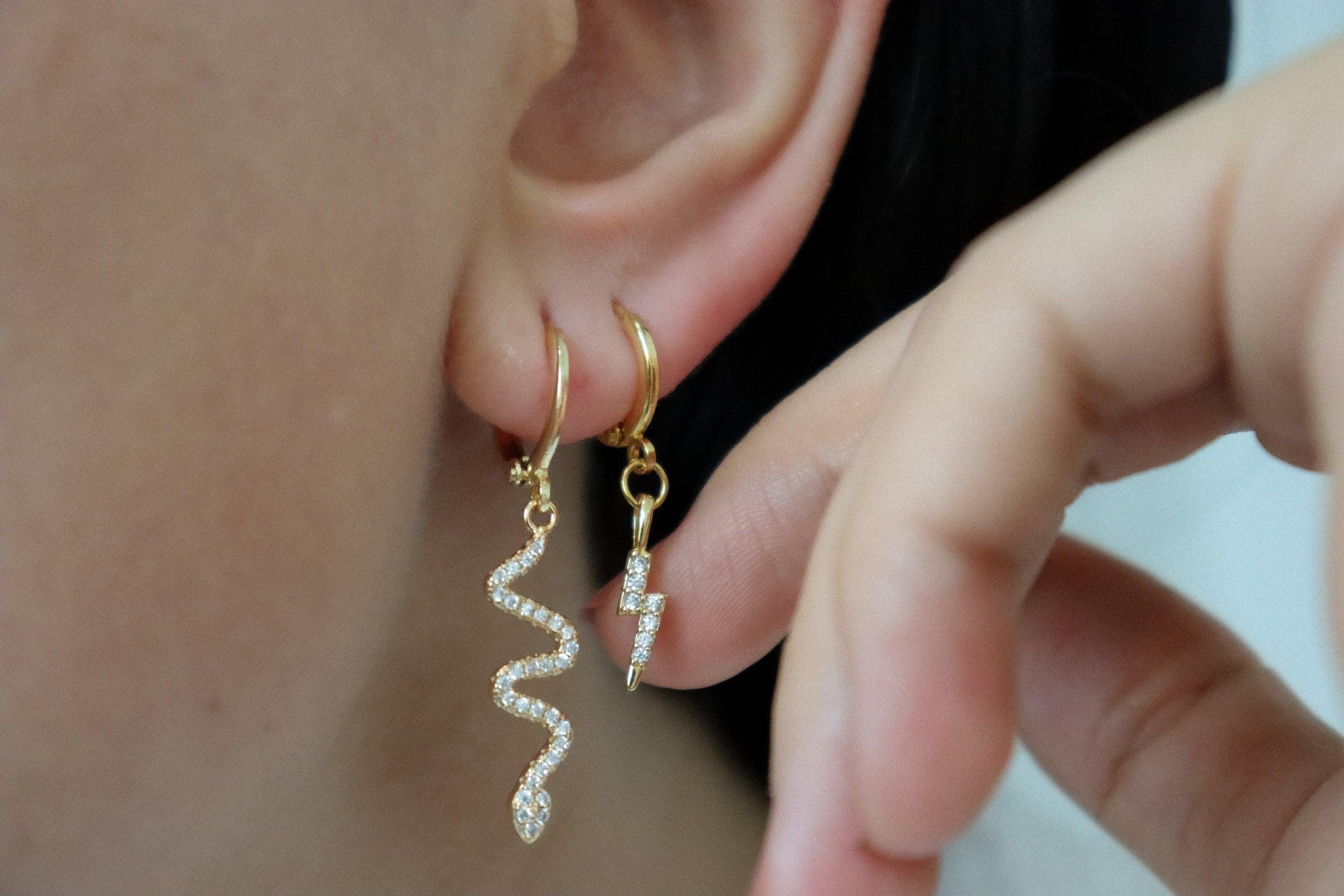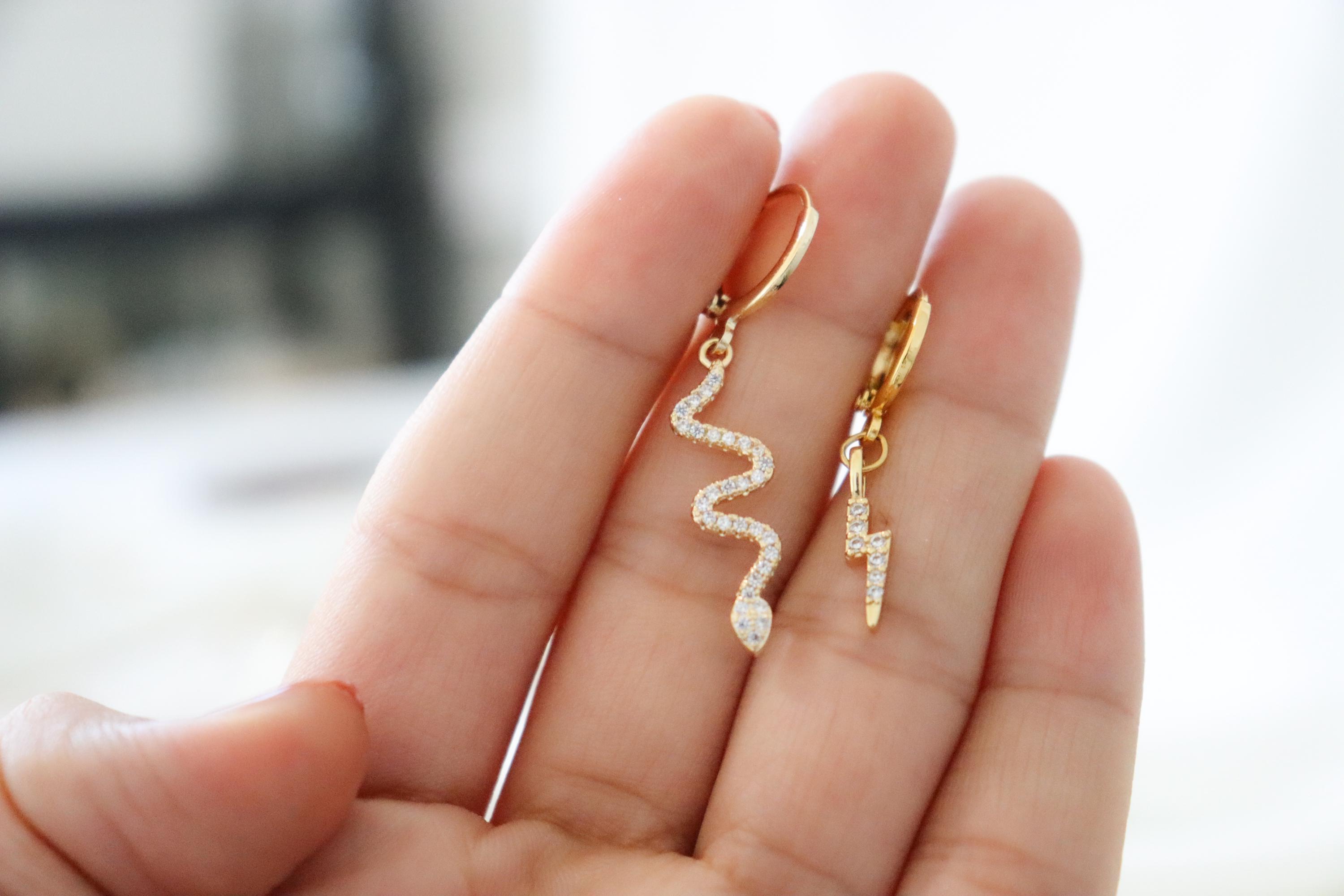 GOLD SNAKE & LIGHTNING PENDANT EARRINGS WATERPROOF JEWELRY ✨ 14K Gold Snake Lightning Hoop Earrings Gold Hoop Earrings Tiny Snake Earrings Reptile Lightning Bolt Earrings Thunder Waterproof Earrings