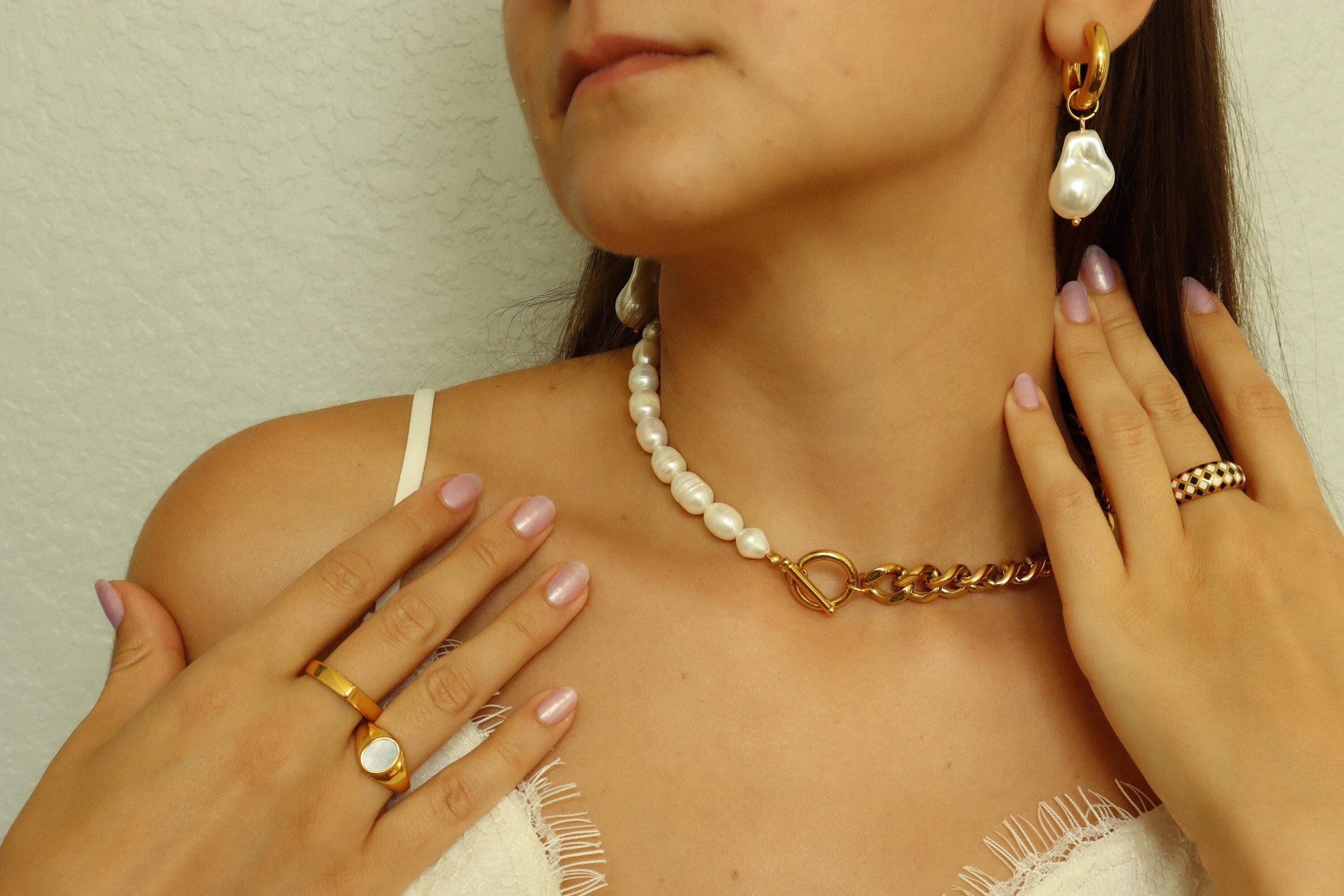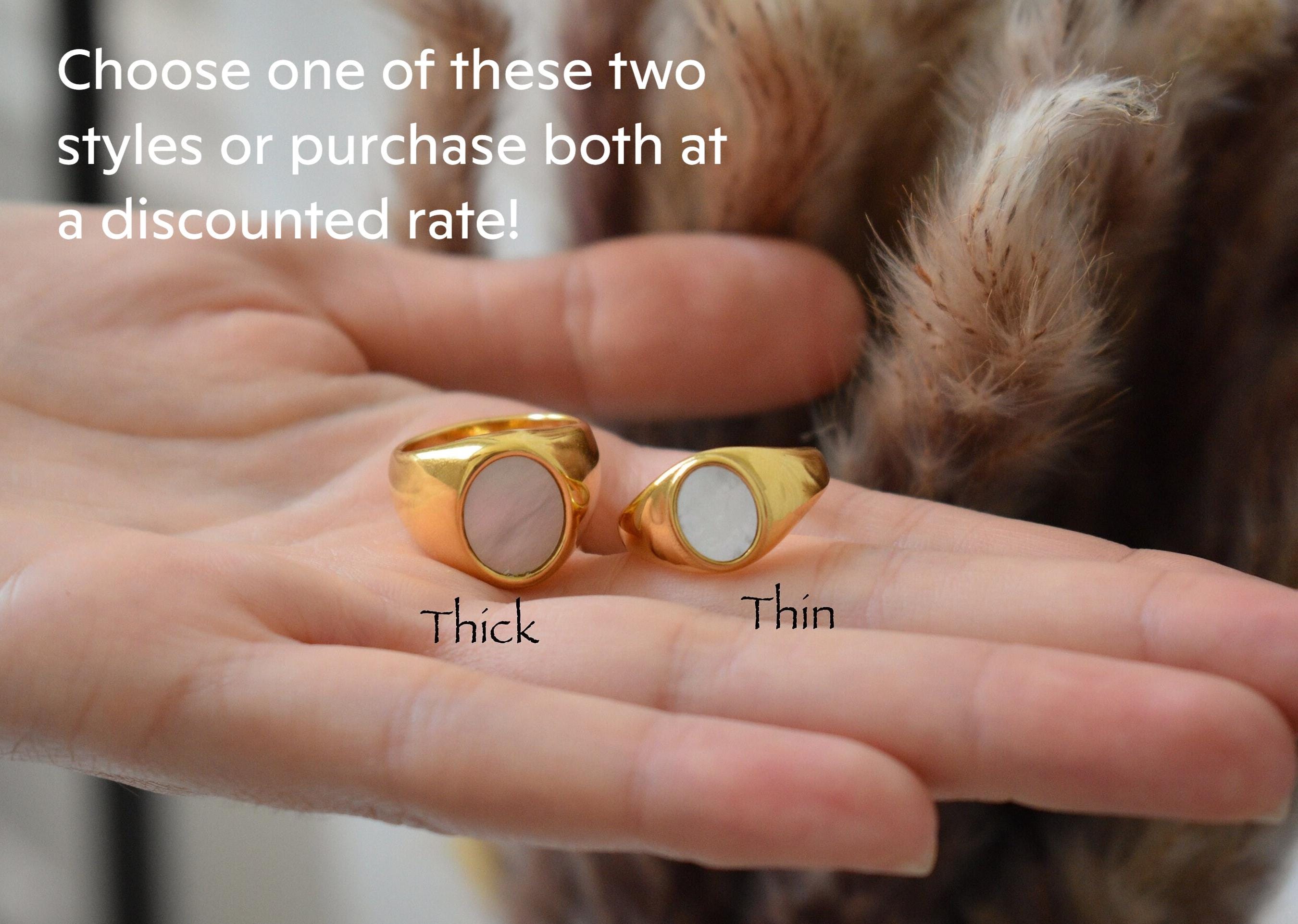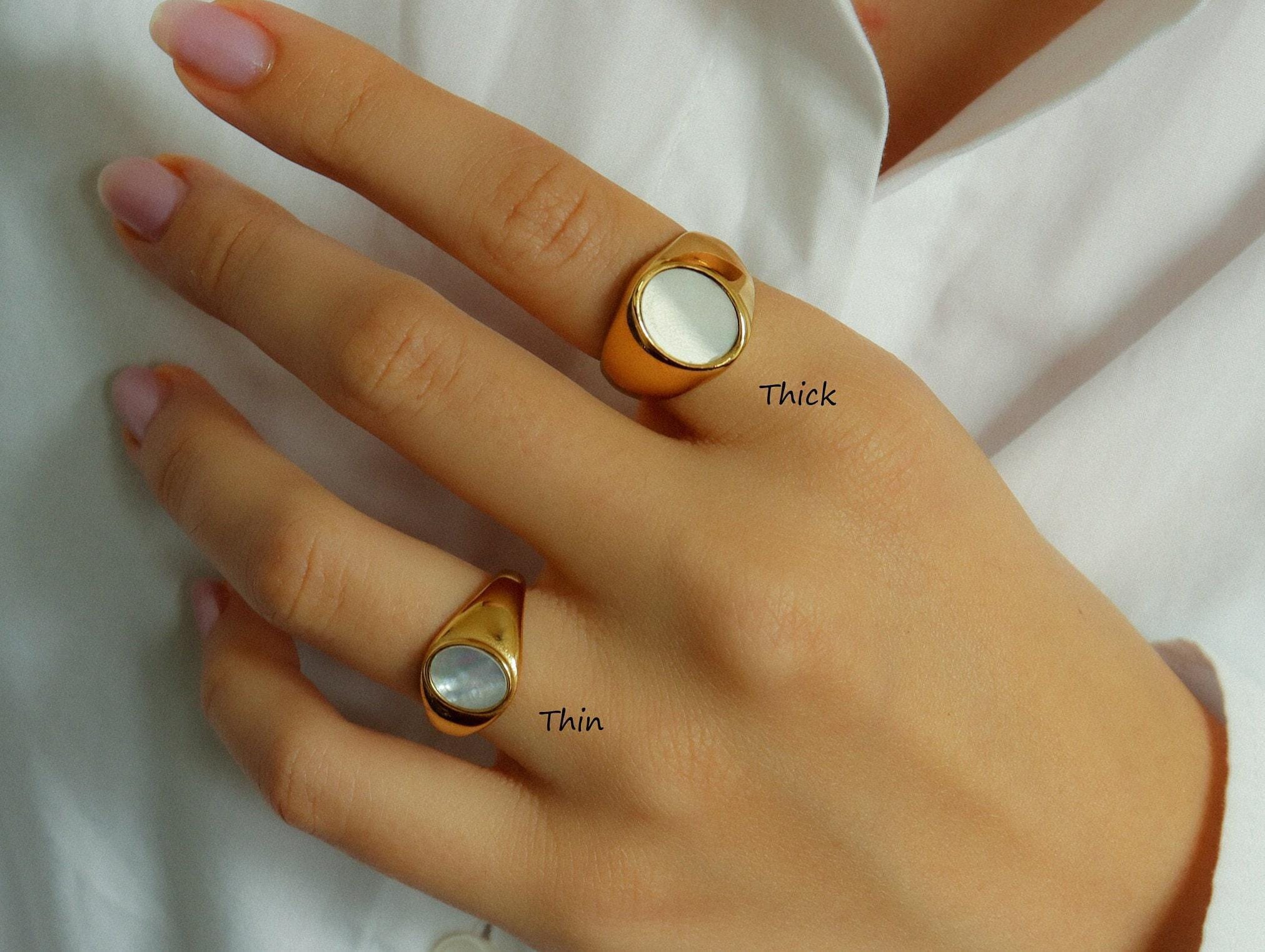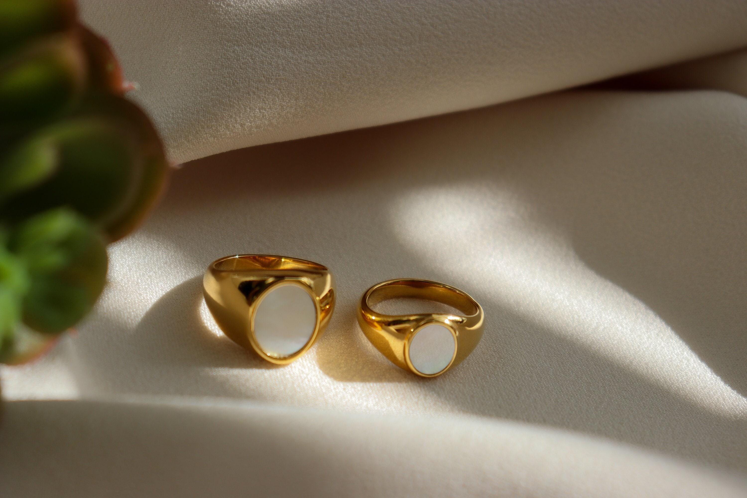 Gold 18k Statement Band Ring Oval Natural Mother of Shell Pearl Signet Rings Collection Engraving Name Date Engraving Inside the Ring Customized Personalized Shower Ready Rings✨