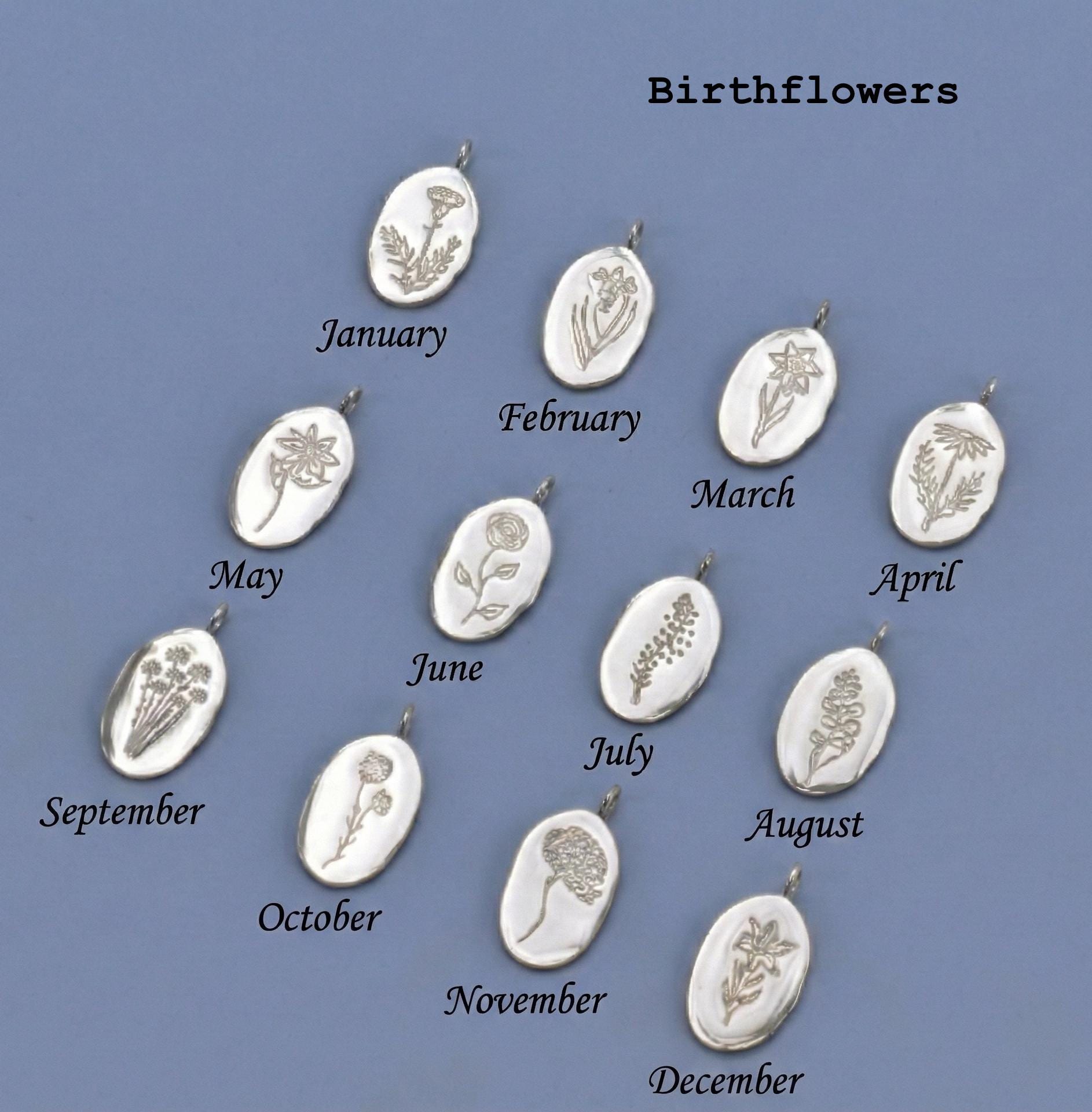 For example, January birthdays are celebrated with a lovely carnation necklace, while May birthdays are celebrated with a lovely Lily pendant. Additional birthflowers included are Iris, Daffodil, Daisy, Rose, Larkspur, Gladiola, Aster, Calendula, Chrysanthemum, and Poinsettia.