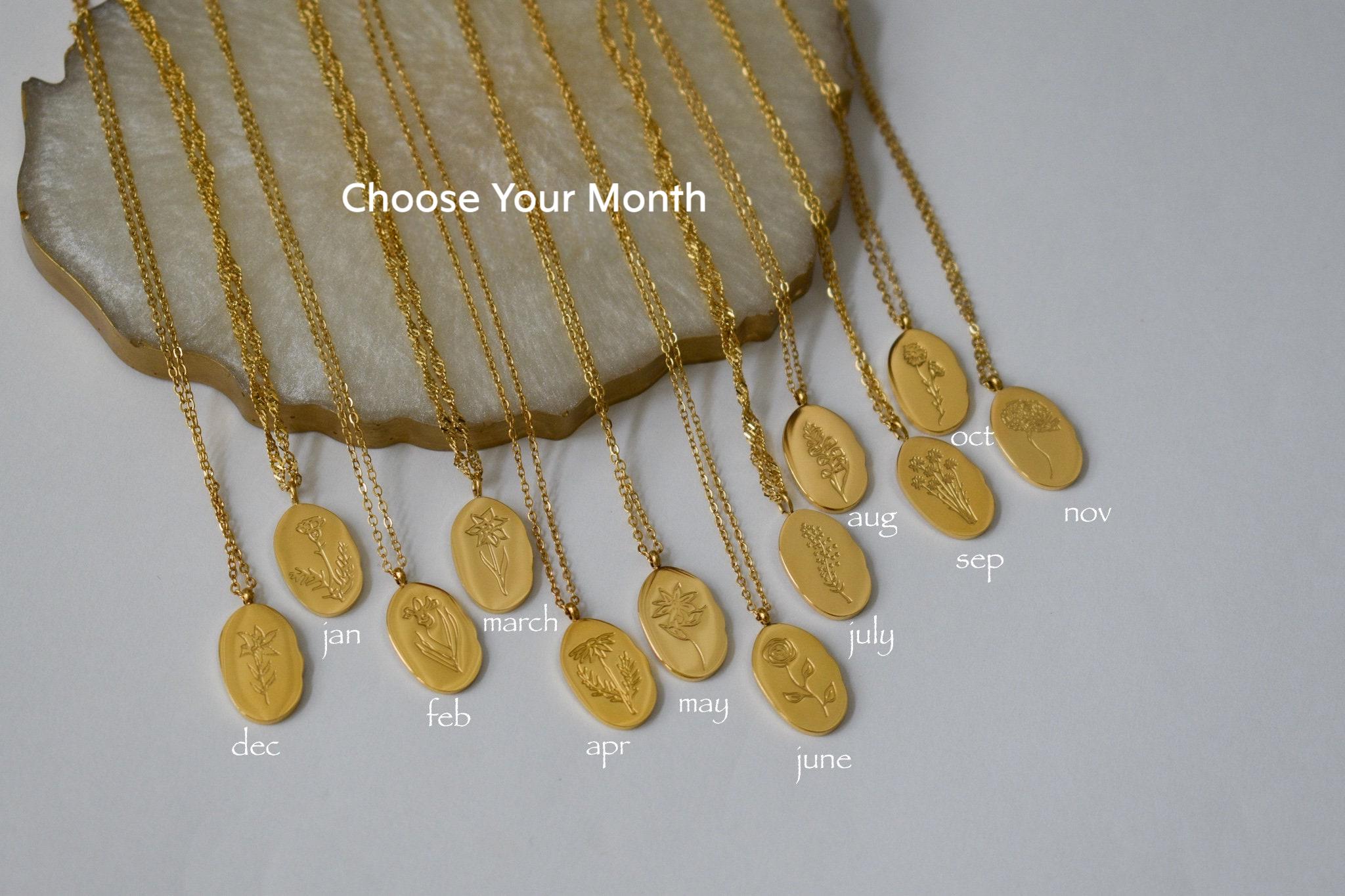Each necklace features a delicate flower pendant that corresponds to the flower associated with your birth month.
