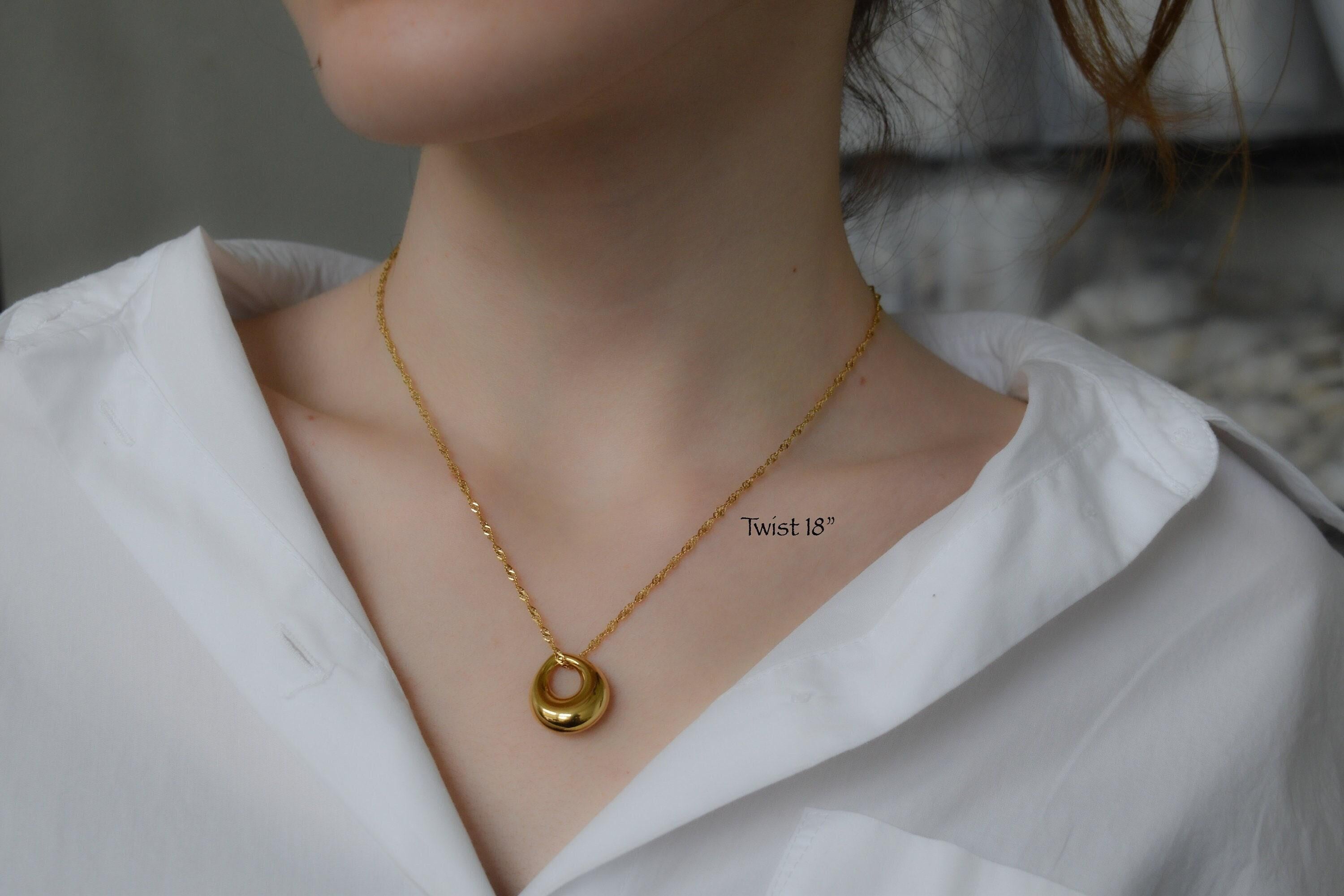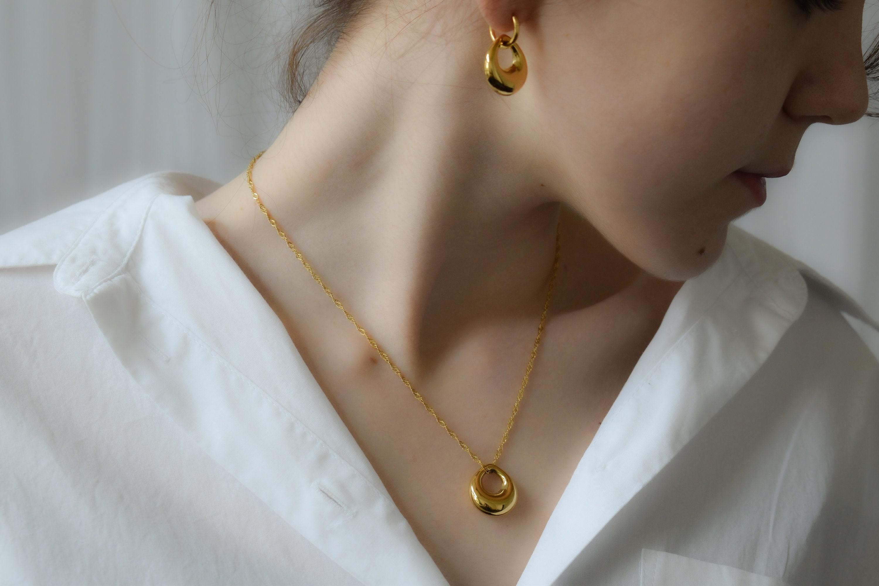 Gold Water Drop Pendant Necklace Figaro Twist Cable Chain • Double Hoop Huggie Drop Earrings • SET Vintage Waterproof Dainty Jewelry Gift