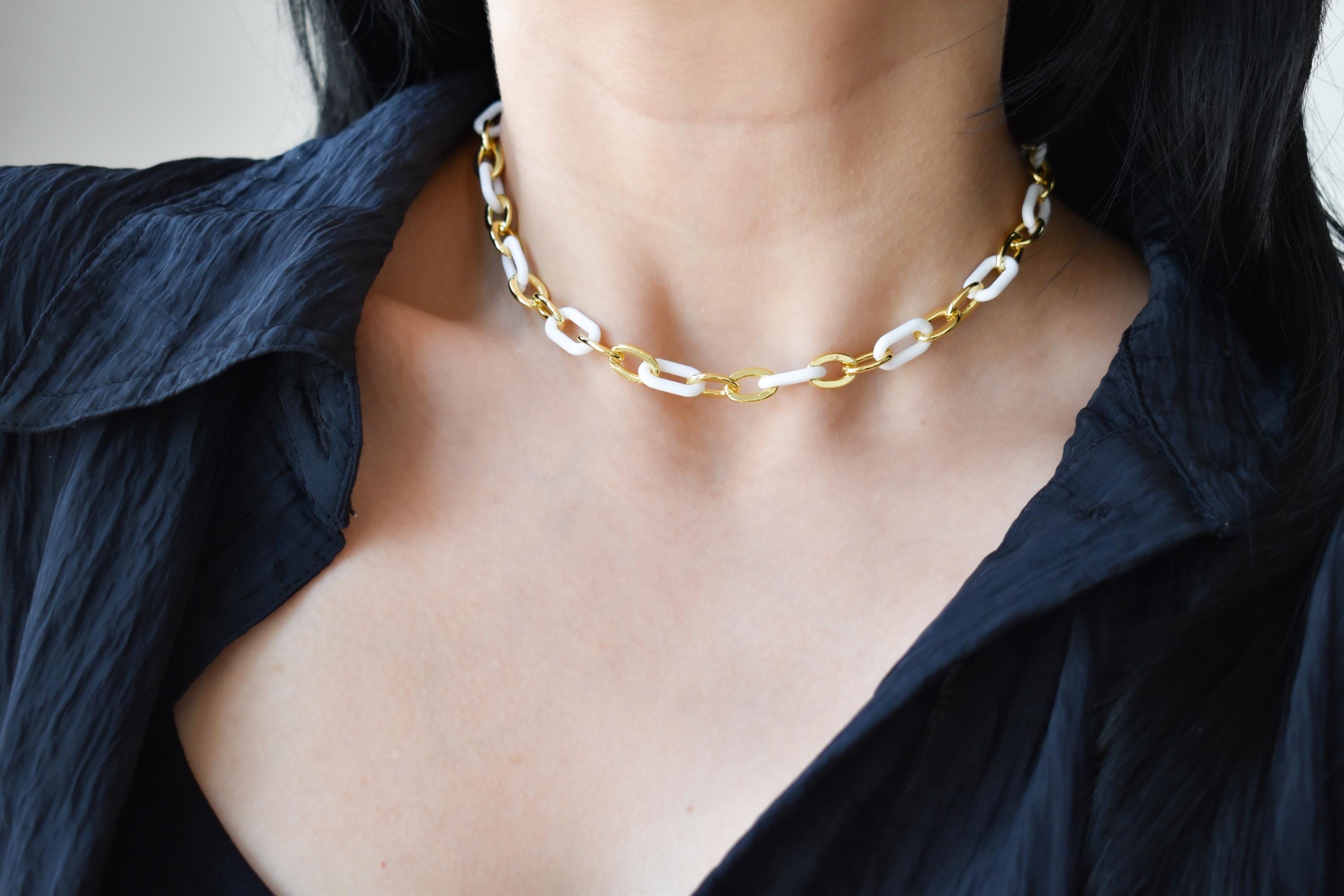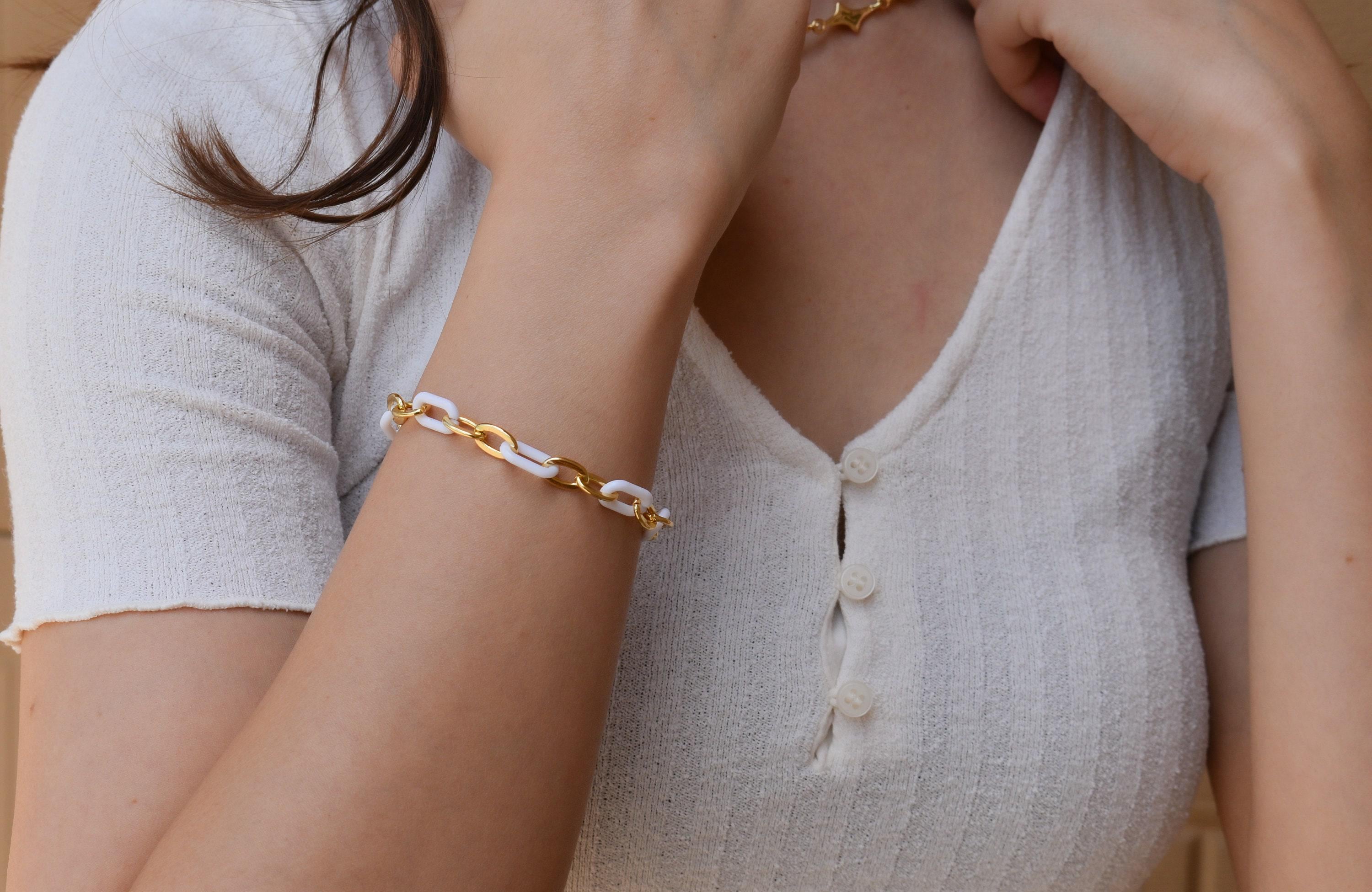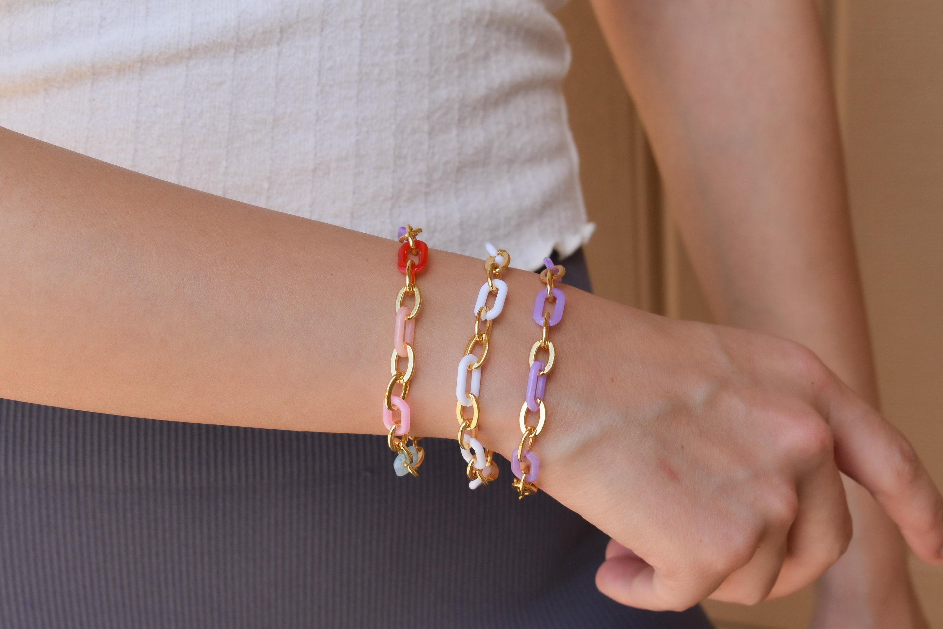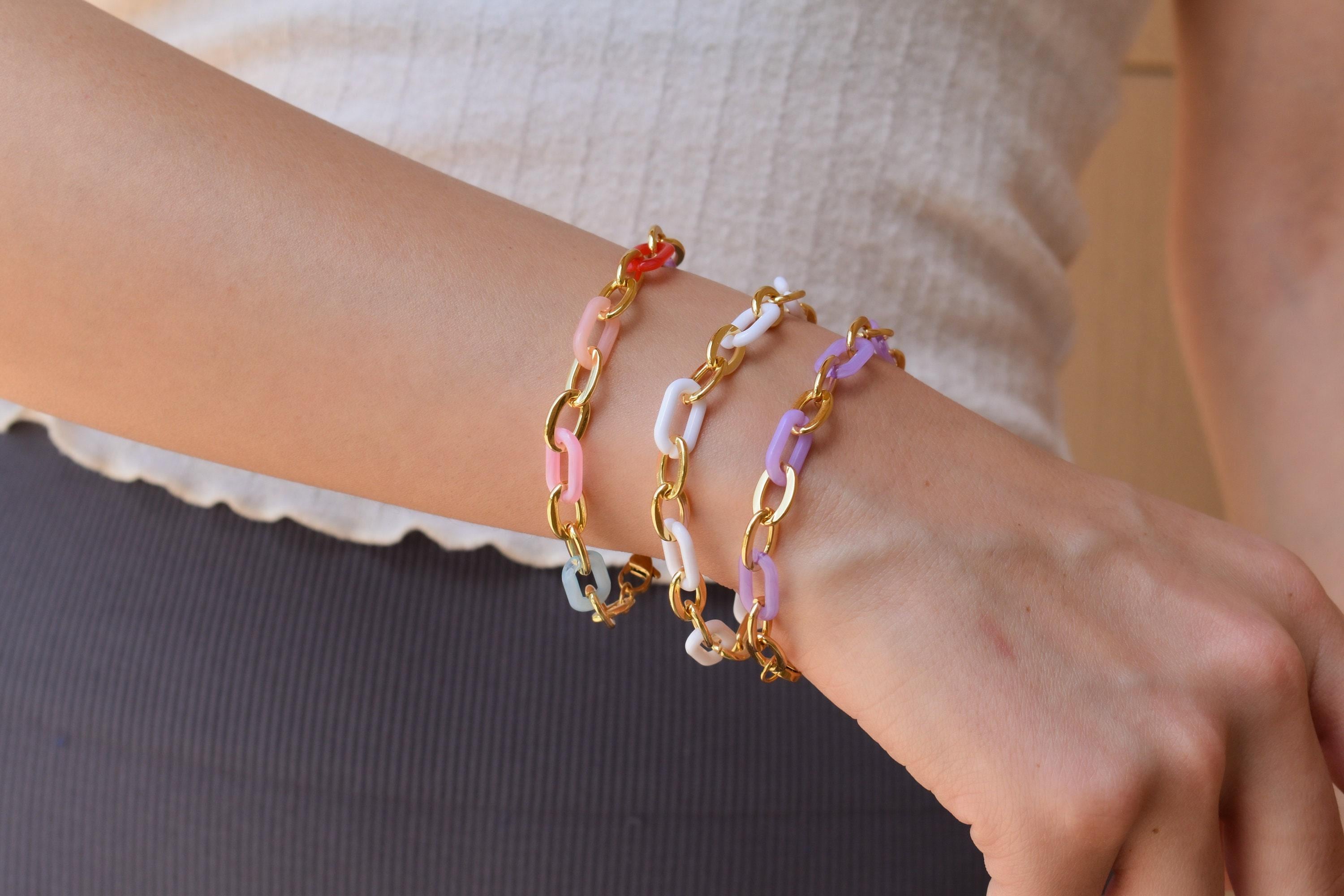 Each bracelet features a mix of gold-plated links and vibrant enamel-coated chain pieces, giving it a bold yet elegant look. Perfect for layering or wearing solo.