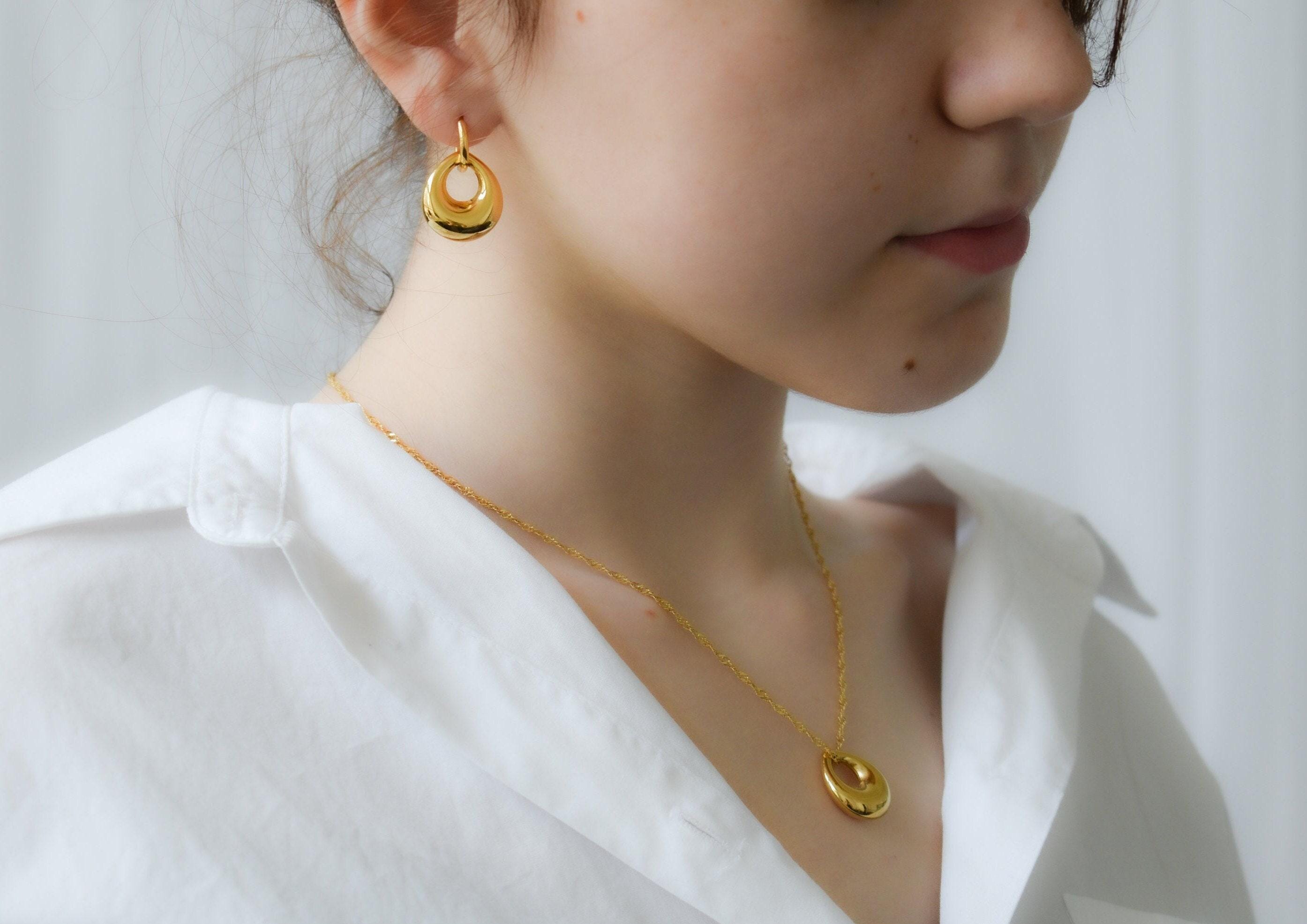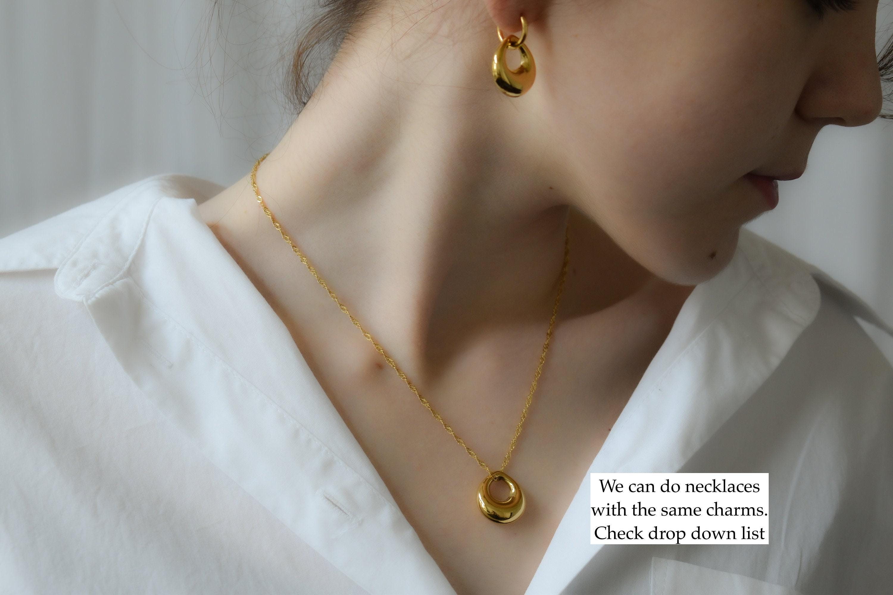 Gold Water Drop Pendant Necklace Figaro Twist Cable Chain • Double Hoop Huggie Drop Earrings • SET Vintage Waterproof Dainty Jewelry Gift