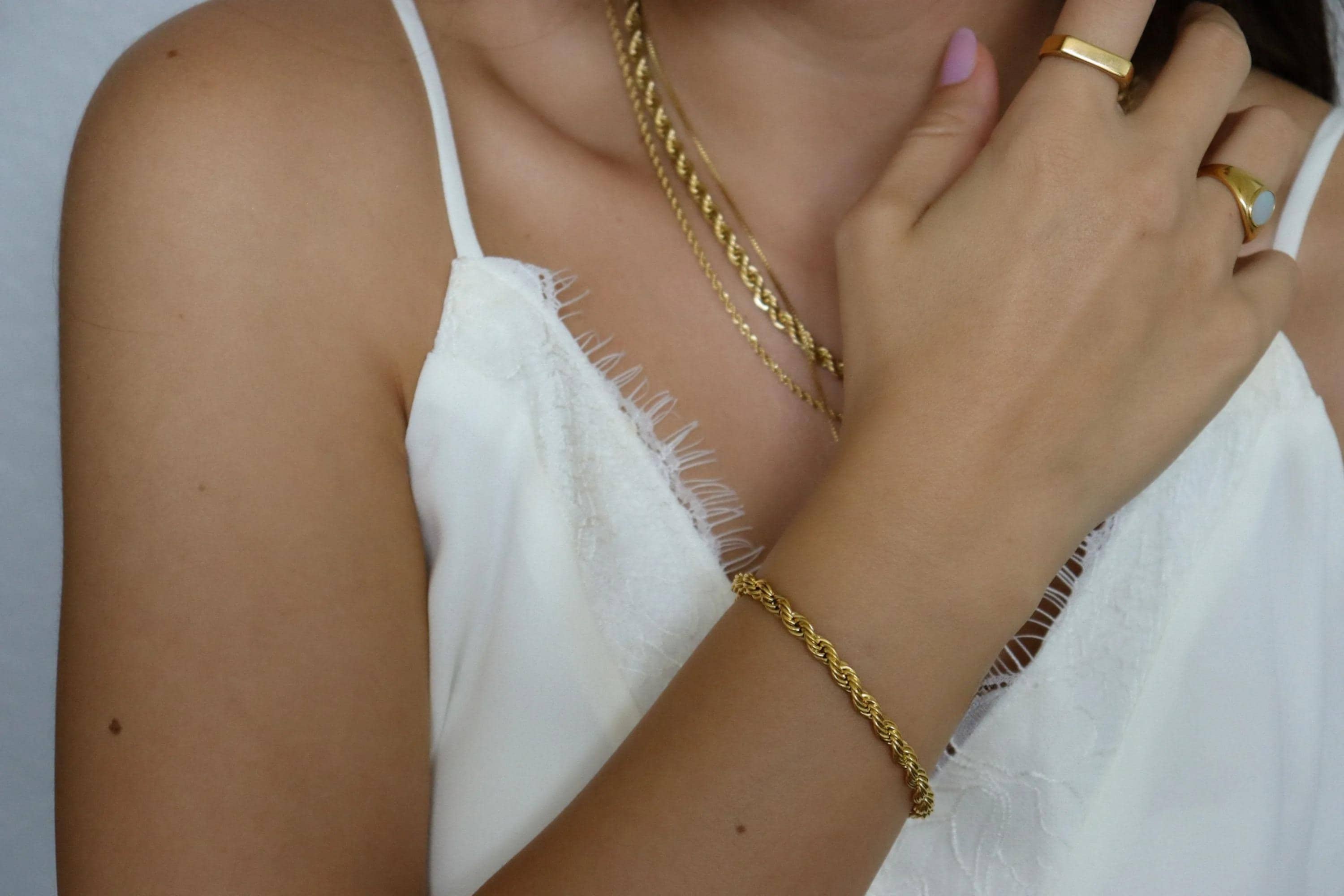 Such a perfect gold rope anklet! Great quality, waited a little bit to make a review so I could test in the pool and beach. No tarnish, no breaks! Still wearing everyday! Will be buying again!