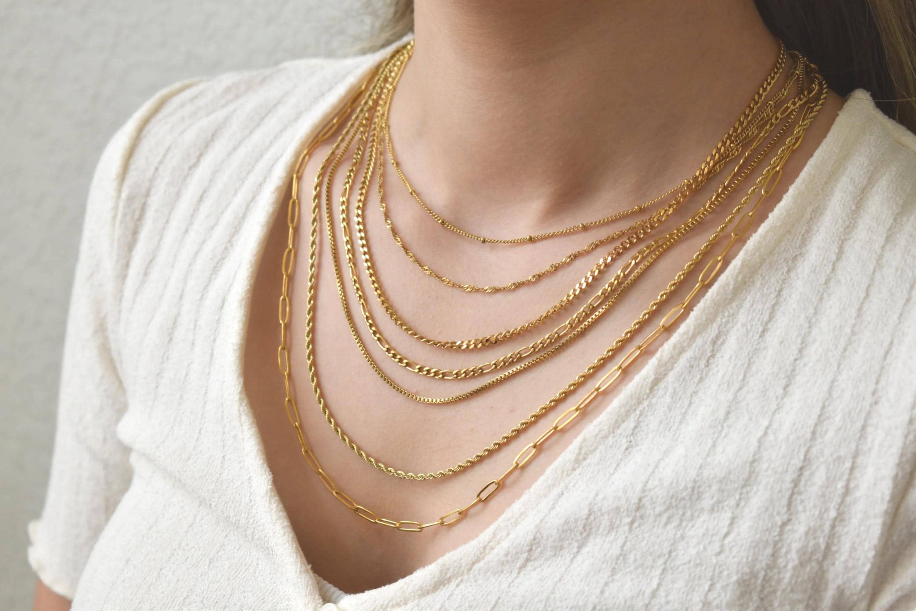 Gold FILLED Chain Necklace - Link Chain Twist Chain Figaro Chain Bead Herringbone Necklace Pearl Necklace for Women Men, Kids Waterproof